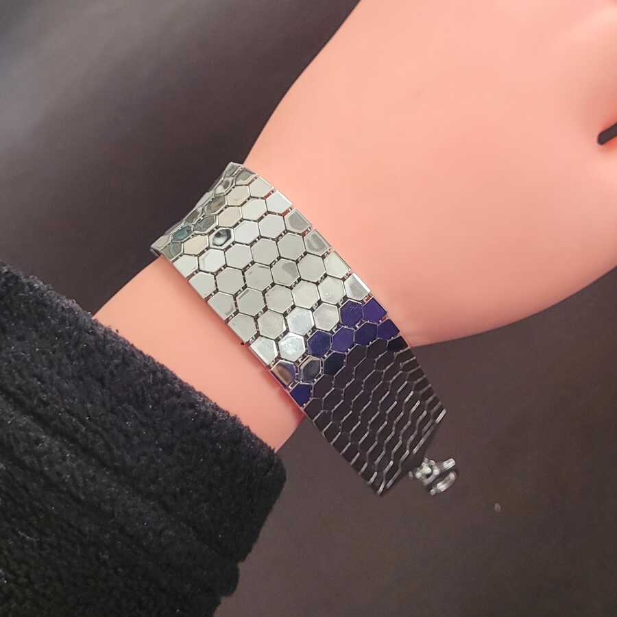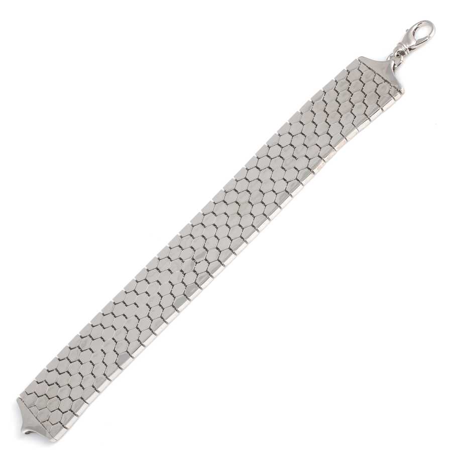Bileklik 925 ayar gümüşten imal edilmiştir. 6 sıra petek model bileklik 19 cm uzunluğundadır. Bileklik 2,5 cm enindedir. Bileklik taşsızdır. Gümüş bileklik 36,87 gram ağırlığındadır.