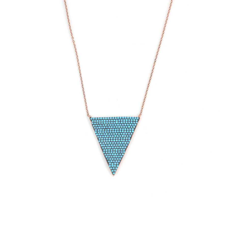 Gümüş kolye 925 ayar gümüşten yapılmıştır. Üçgen model kolye 3,0 cm'ye 2,5 cm boyutlarındadır. Zinciri 40 cm uzunluğundadır. Kolye zirkon taşlıdır. Ağırlığı 4,3 gramdır.