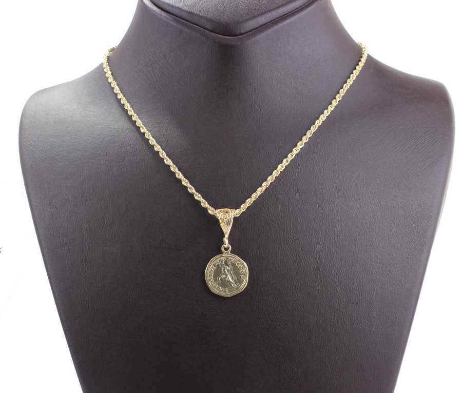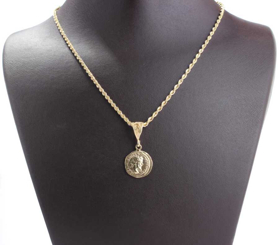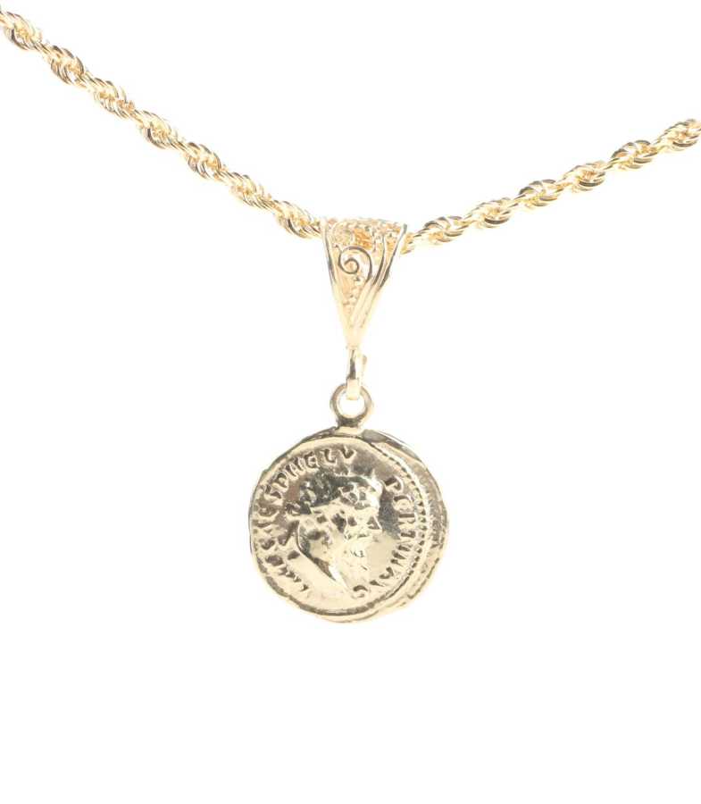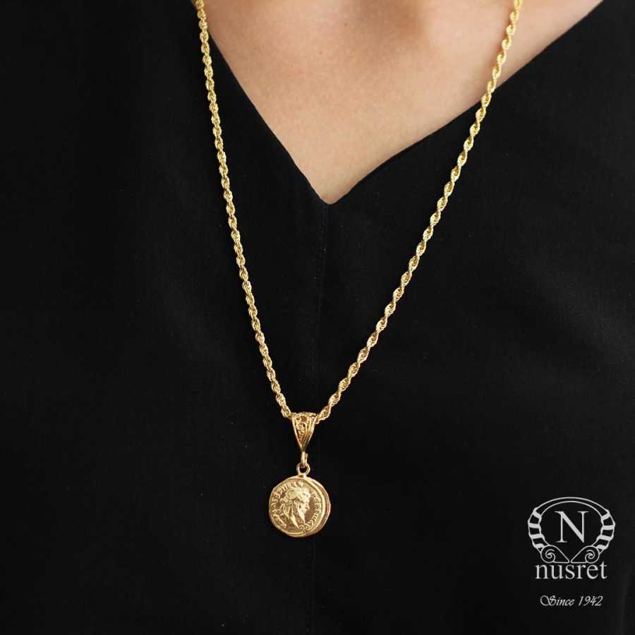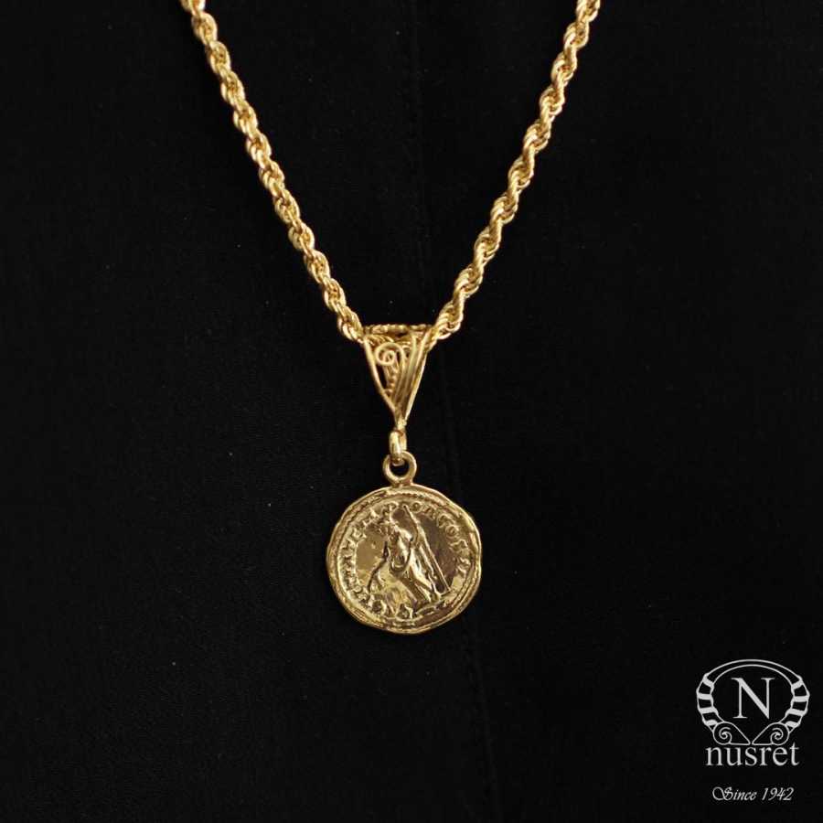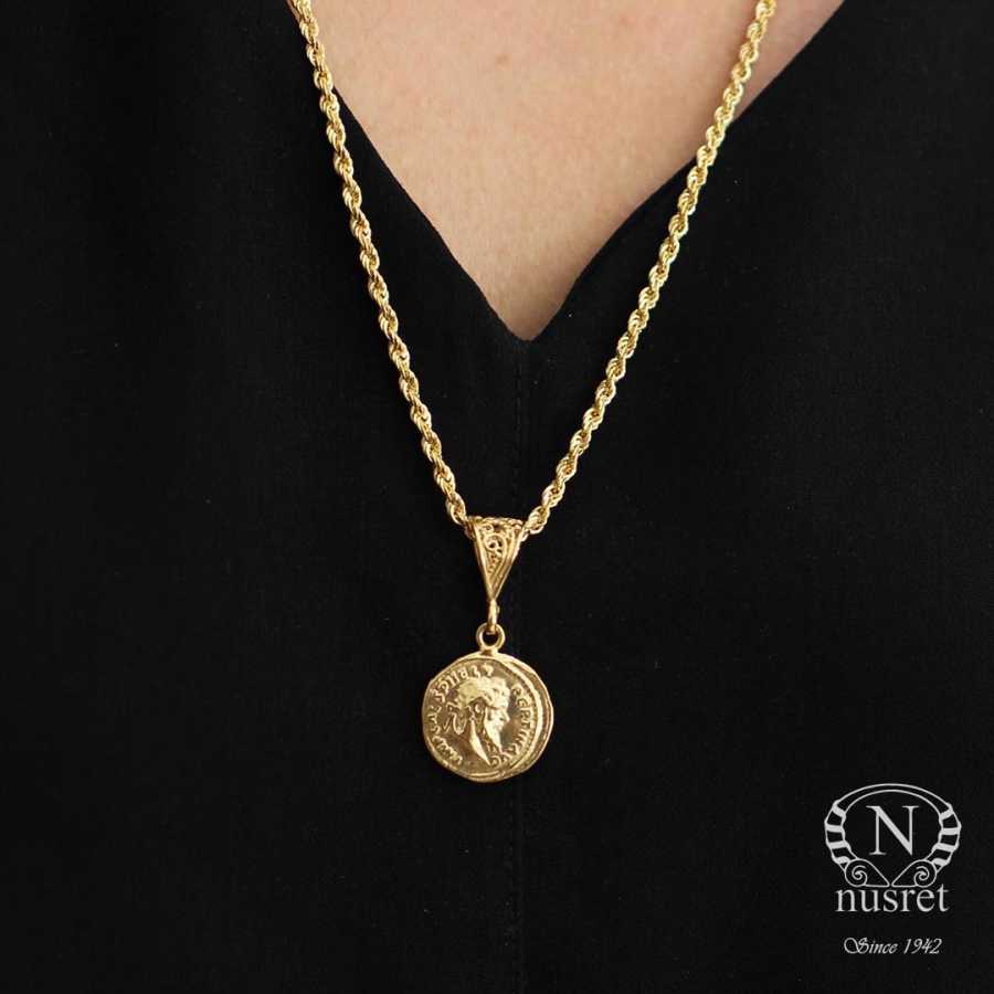 Gümüş kolye 925 ayar gümüşten yapılmıştır. Publius Helvius madalyon kolye halat zinciri 58 cm uzunluğundadır. Kolye taşsızdır. Publius Helvius Pertinax Roma İmparatoru MS193 kolyenin arka tarafında ise sağ elinde çelenk sol elinde asa tutan doğurganlık ve bolluk tanrıçasının simgeleri bulunur. Ağırlığı 13,4 gramdır.