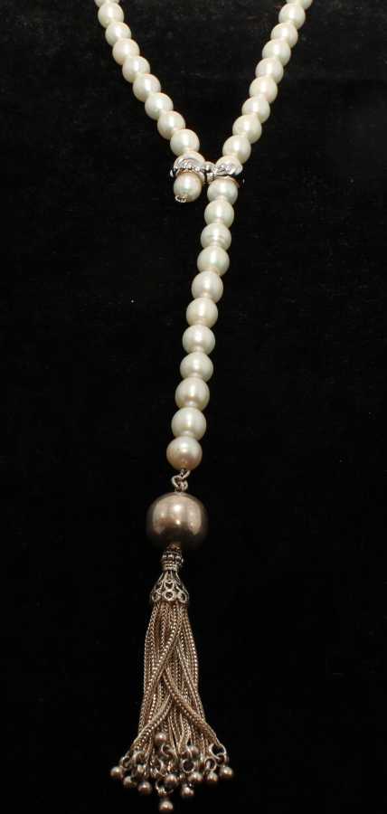 Gümüş kolye 925 ayar gümüşten yapılmıştır. Gümüş kolye 44 cm uzunluğundadır. İnci kolyenin ucunda gümüş püskül vardır. Kolye inci taşlıdır. Ağırlığı 56,81 gramdır.