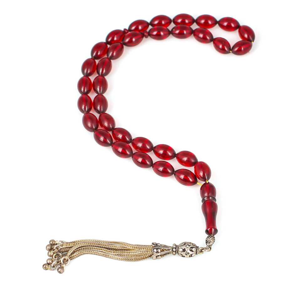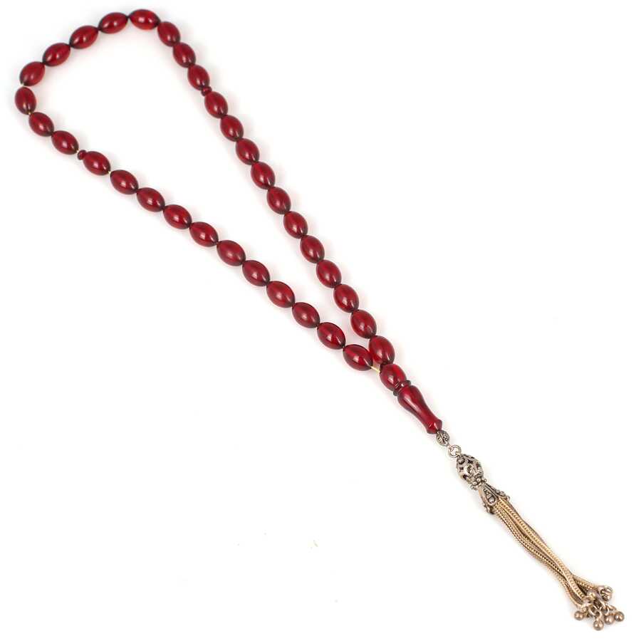 Arpa kesim turuncu renk sıkma kehribar tesbih taşı 1,1 cm'ye 0,7 cm boyutlarındadır. Tespih imamesi dahil 23 cm uzunluğundadır. Gümüş püskülü 7 cm uzunluğunda olup toplam uzunluğu 30 cm'dir. Tespihin ağırlığı 19,4 gramdır.