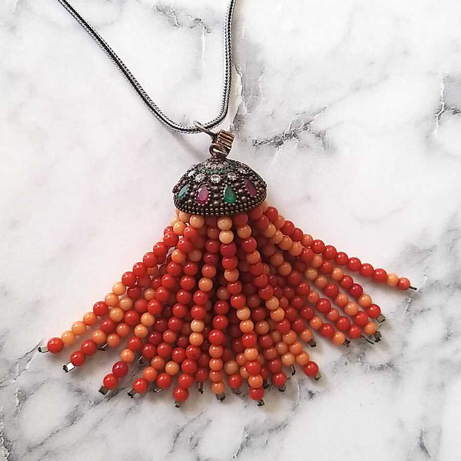 925 Ayar Gümüş Renkli Mercan Taşlı Uzun Püskül Kolye