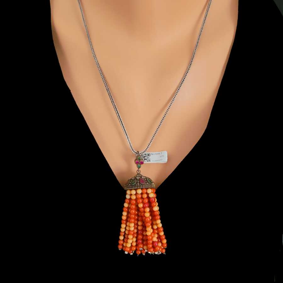 925 ayar gümüştür. Kolye zinciri 60 cm uzunluğunda ve tilki kuyruğudur. Kolye ucu uzunluğu: 7,5 cm dir. mercan ve renkli zirkon taşlı püskül şeklinde uzun kolyedir. Gramı: 37,78 gr