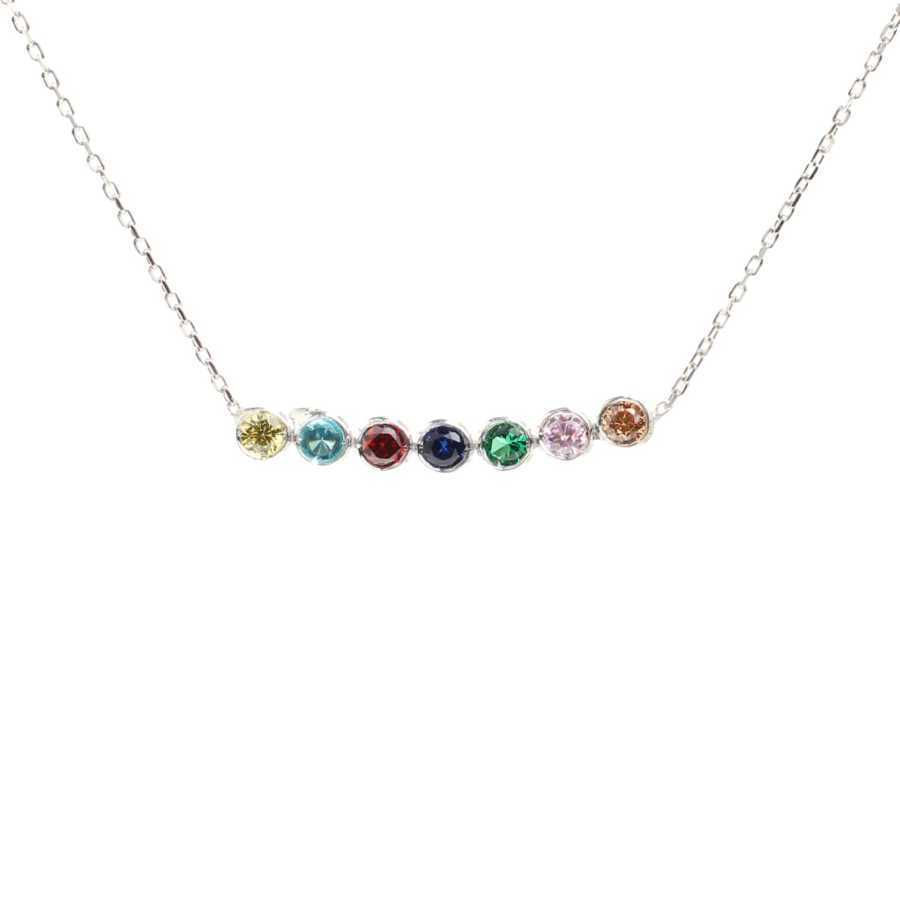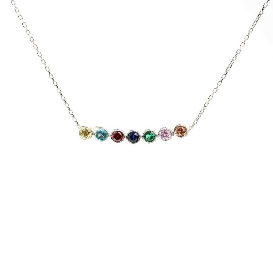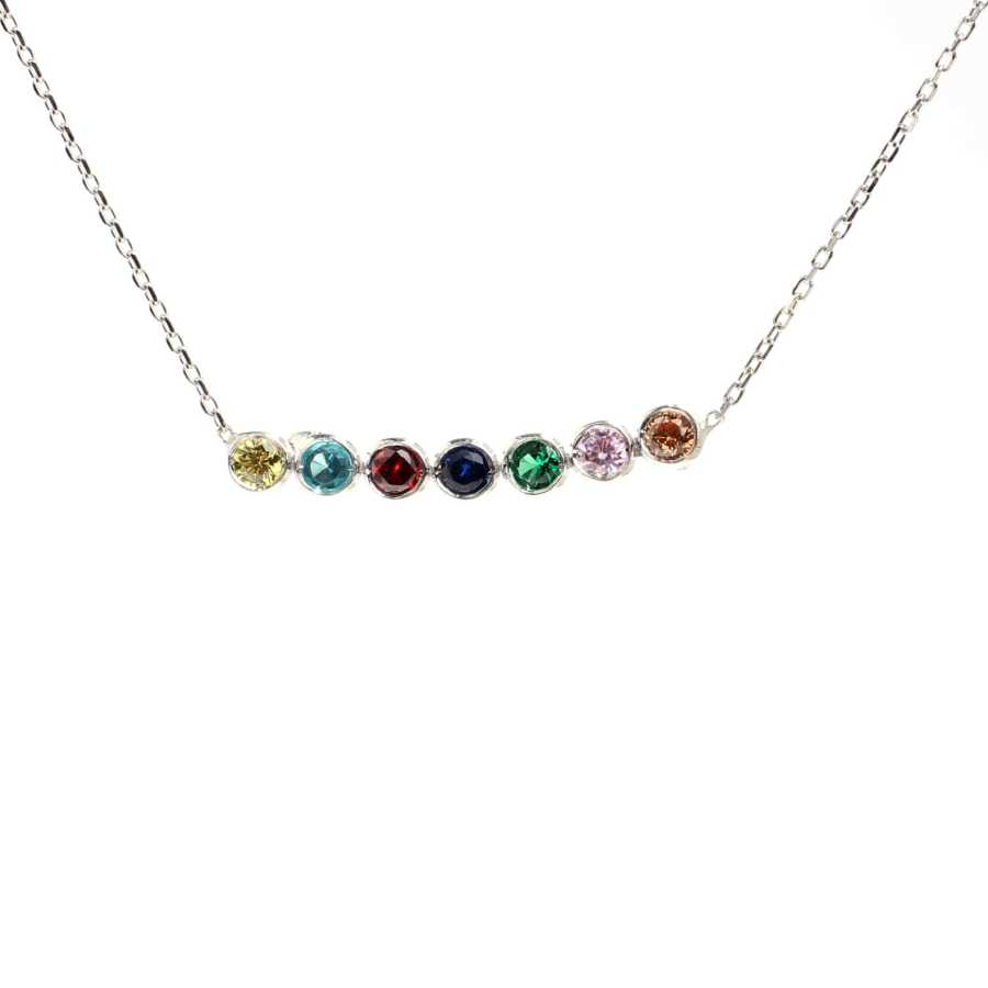 Gümüş kolye 925 ayar gümüşten yapılmıştır. 7 sıra su yolu model kolye 3,4 cm'ye 0,7 cm boyutlarındadır. Zinciri 42 cm uzunluğundadır ve taşları limon kuvars, peridot, garnet, pembe kuvars, sitrin, safir ve zümrüt renk zirkondur. Ağırlığı 2,4 gramdır.