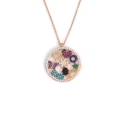 Bu kolye 925 ayar gümüşten üretilmiştir. Şans kolyesi 2,3 cm boyutlarındadır. Zinciri 41 cm uzunluğundadır. Kolye renkli zirkon taşlıdır. Ağırlığı 3,61 gramdır.