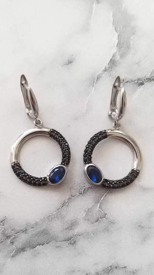Gümüş küpe 925 ayar gümüşten yapılmıştır. Taşlı yuvarlak model küpe 3,4 cm'ye 1,9 cm boyutlarındadır. Küpe siyah ve safir renk zirkon taşlıdır. Ağırlığı 4 gramdır.