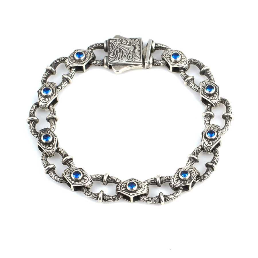 Bileklik 925 ayar gümüşten imal edilmiştir. Roma dönemi model bileklik 1,3 cm enindedir. Antik bileklik 21,5 cm uzunluğundadır. Bileklik safir renk taşlı ve bileklik üzerinde eskitme işlemi yapılmıştır. Ağırlığı 166,14 gramdır.