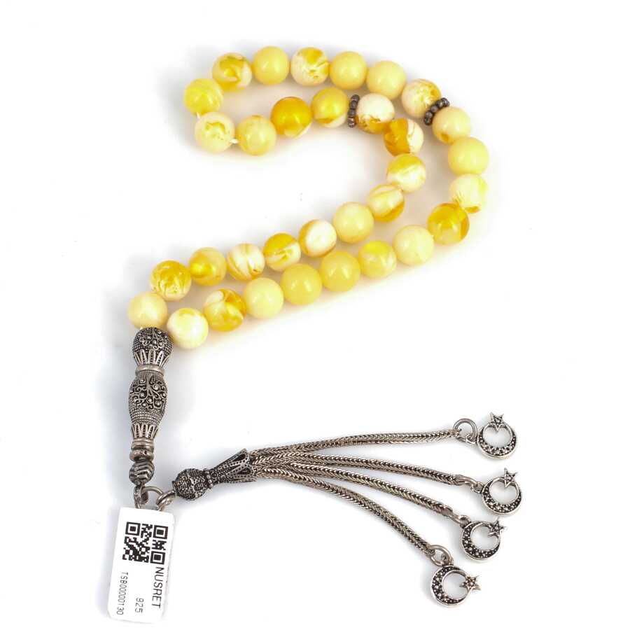 925 Ayar Gümüş Sarı Rengi Sıkma Kehribar Tesbih, Ay yıldız Püskül