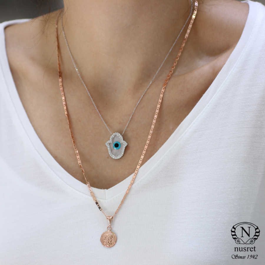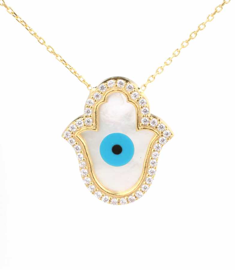 925 Ayar Gümüş Sedef Taşlı Fatma Ananın Eli Kolyesi, Nazar Boncuklu