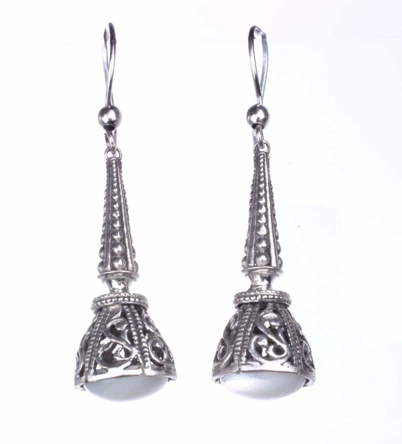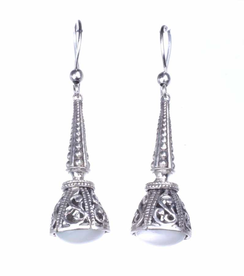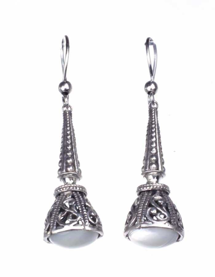 Gümüş küpe 925 ayar gümüşten yapılmıştır. Antik Bizans şeklindeki koni şeklindeki küpe sedef taşlıdır. Ağırlığı 12,22 gramdır.
