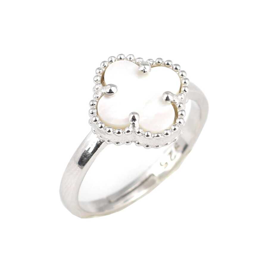 Yüzük 925 ayar gümüşten üretilmiştir Yonca model yüzüğün taşı 1,0 cm boyutlarındadır Yüzüğün üst kısmı 1,2 cm boyutlarındadır Resimdeki yüzük 18 ölçüdür, ancak tüm ölçüler yapılabilmektedir Yüzük zirkon ve sedef taşlıdır . Ağırlığı 2,69 gramdır.