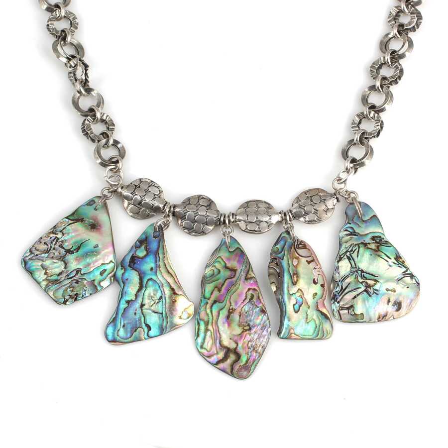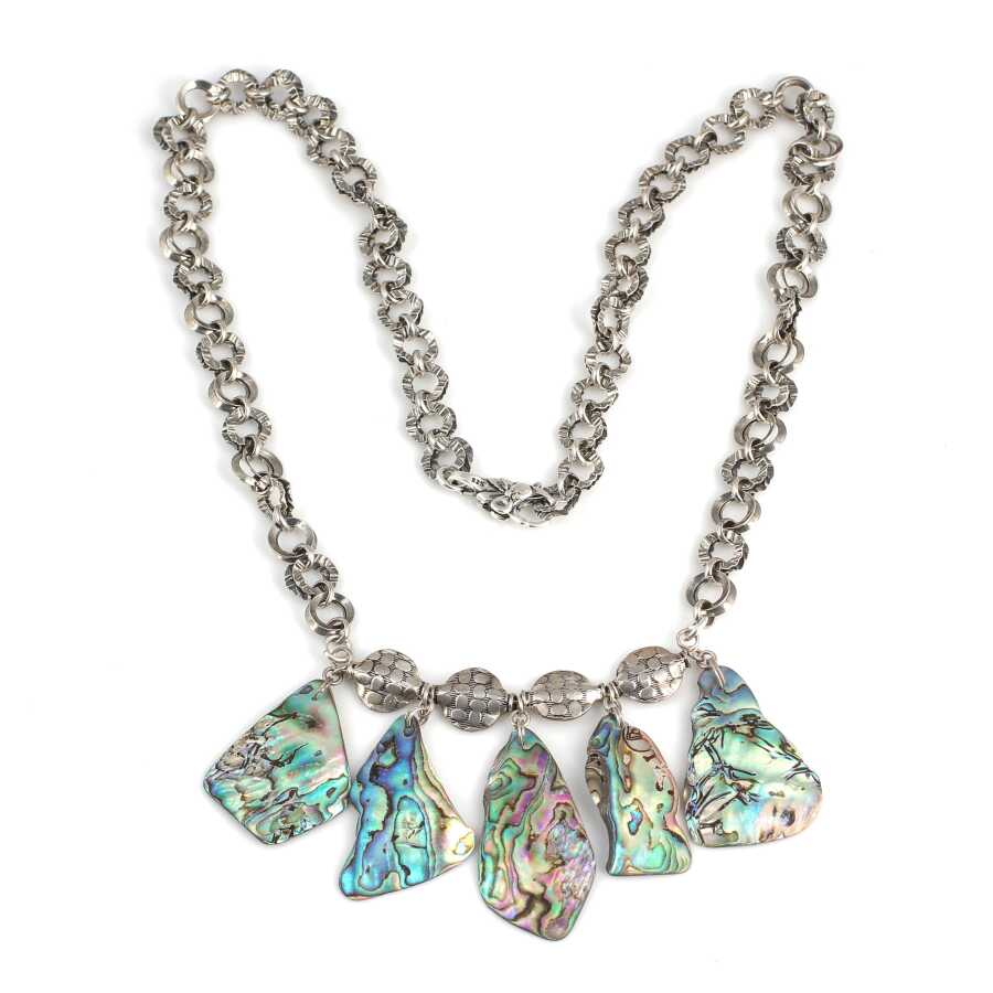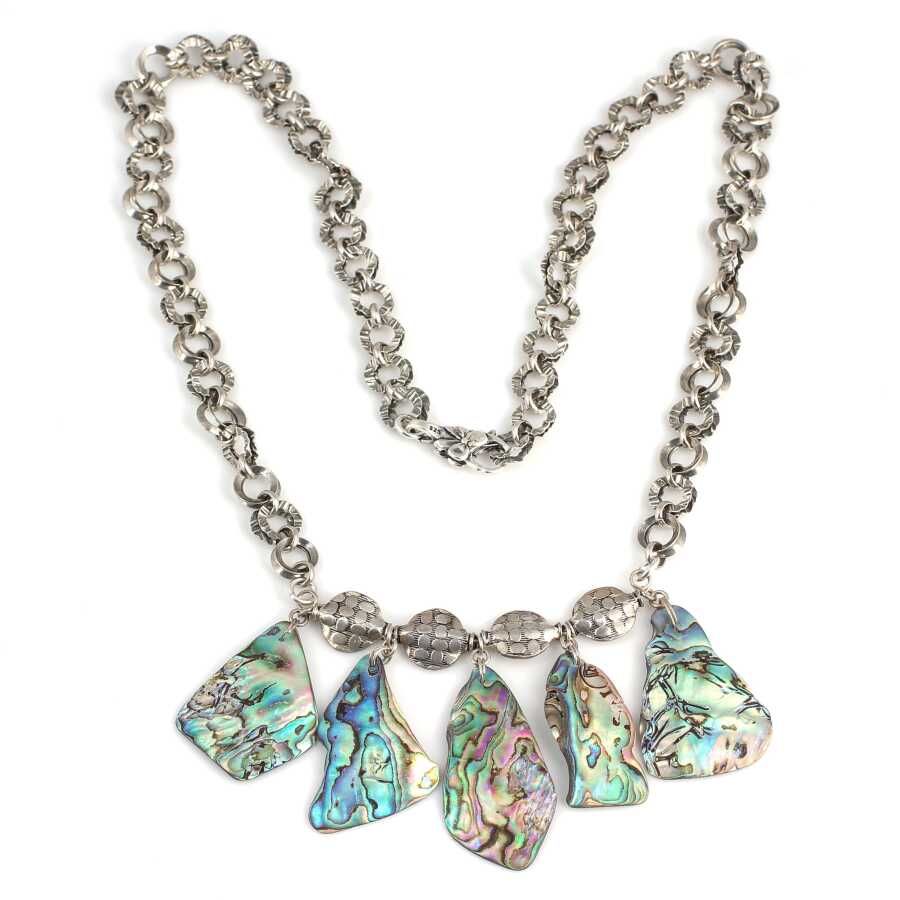 Gümüş kolye 925 ayar gümüşten yapılmıştır. Opal taşlardan oluşan kolye 65 cm uzunluğundadır. Ağırlığı 49,39 gramdır.