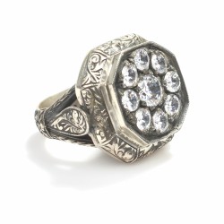 Yüzük 925 ayar gümüşten üretilmiştir. Yüzüğün üzerinde el kalemi atılarak tasarlanmıştır. Taşlı yüzük 2 cm boyutlarındadır. Resimdeki yüzük 26 ölçüdür, ancak tüm ölçüler özel olarak yapılabilmektedir. Yüzük zirkon taşlıdır. Ağırlığı 28,24 gramdır.