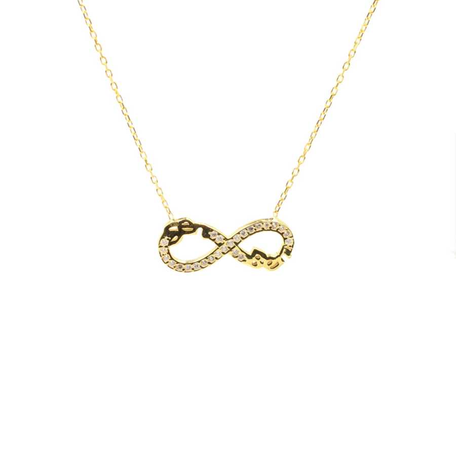 Gümüş kolye 925 ayar gümüşten yapılmıştır. Sonsuzluk şeklindeki kolye 0,9 cm'ye 2,3 cm boyutlarındadır. Zinciri 45 cm uzunluğundadır ve taşları beyaz zirkondur. Ağırlığı 2,35 gramdır.