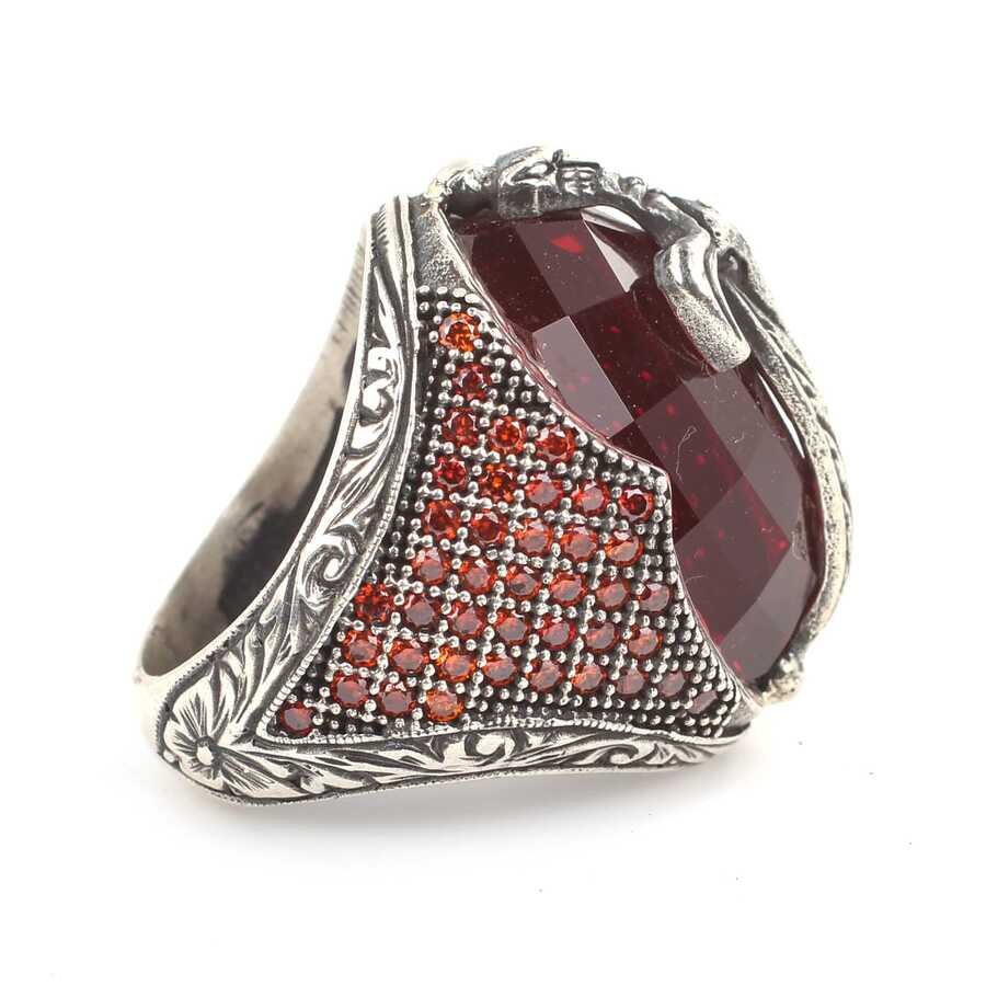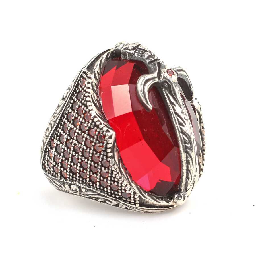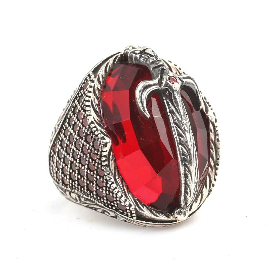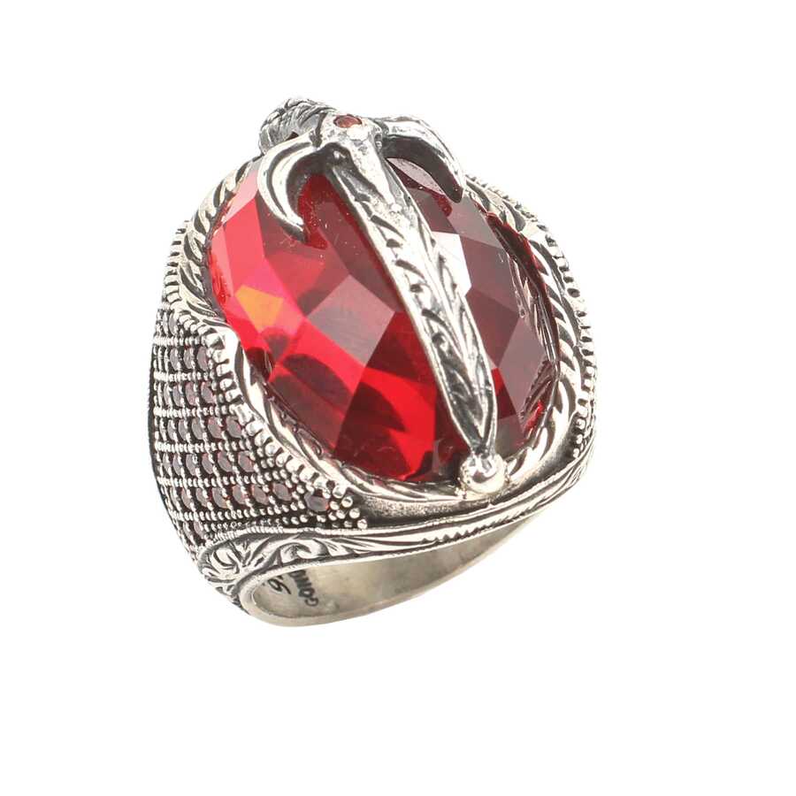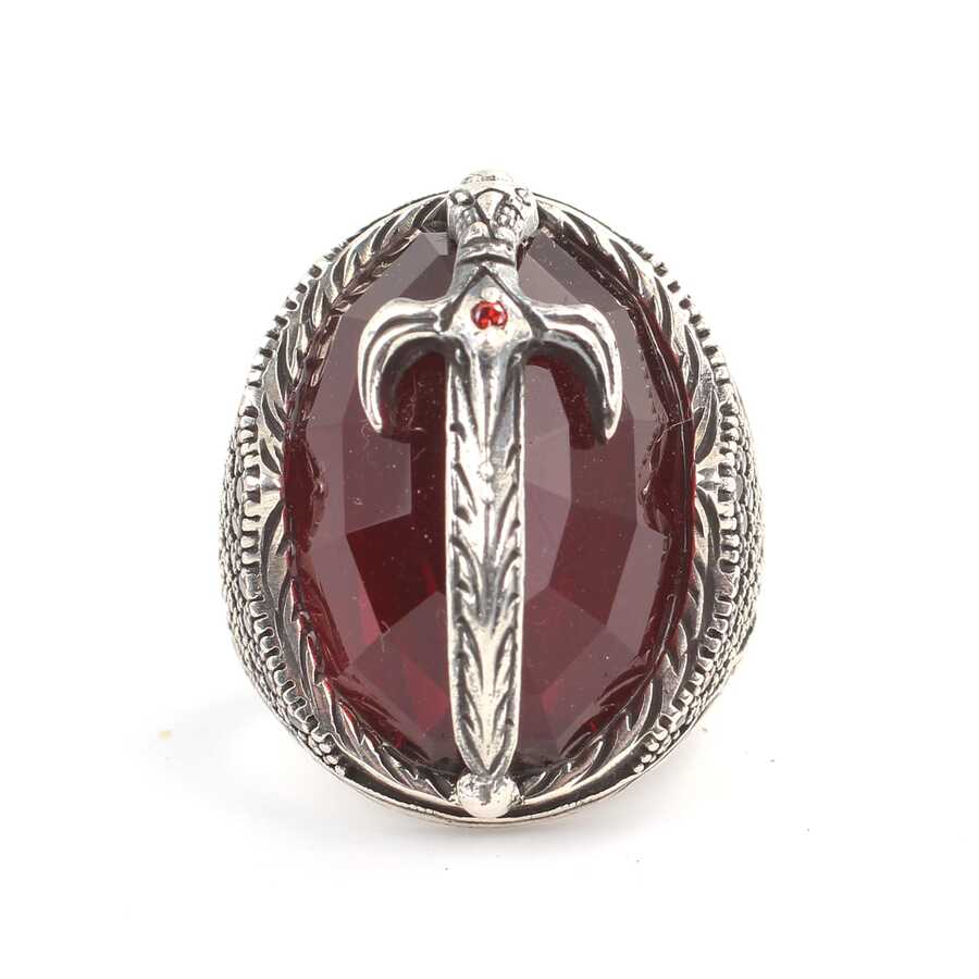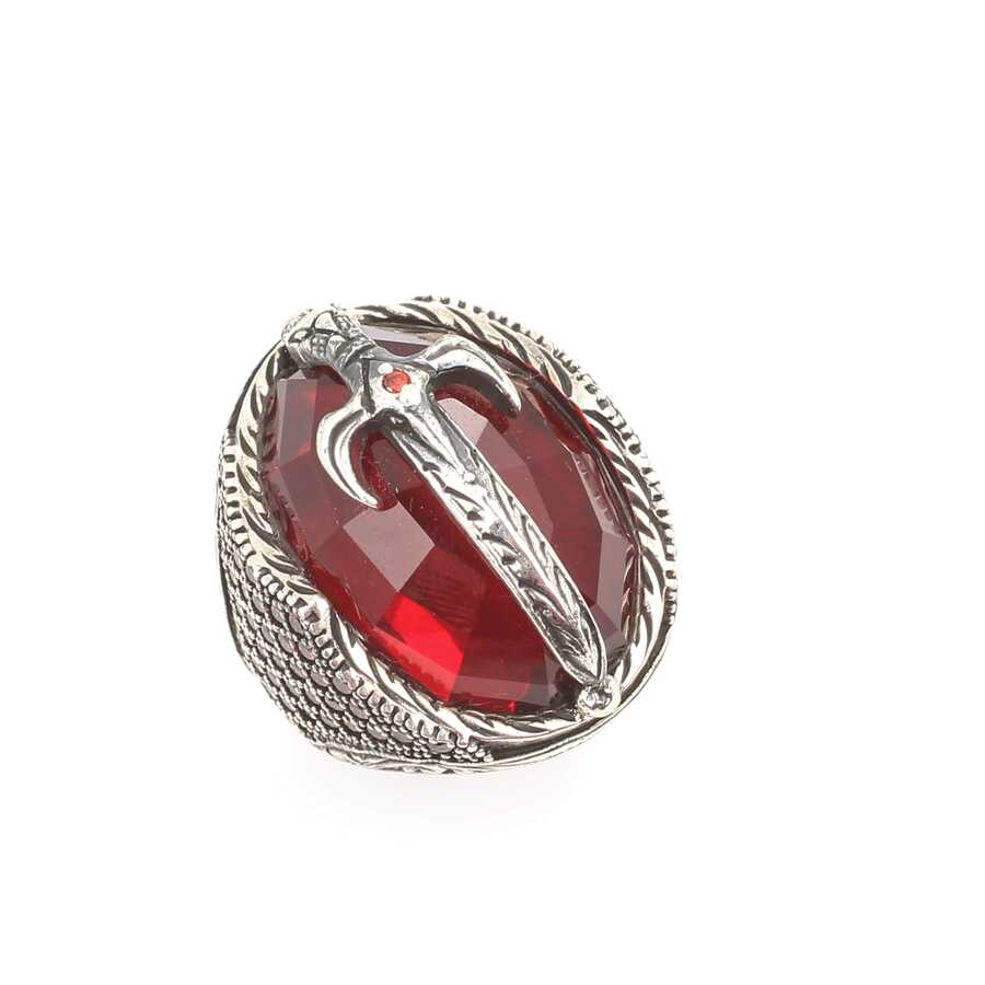 Yüzük 925 ayar gümüşten üretilmiştir Yüzüğün üzerinde el kalemi atılarak tasarlanmıştır. Taşlı yüzük 2,5 cm'ye 1,6 cm boyutlarındadır. Oval sentetik yakut taşlı montür üzerine kılıç konularak tasarlanmıştır. Resimdeki yüzük 19 ölçüdür, ancak tüm ölçüler özel olarak yapılabilmektedir. Yüzük sentetik yakut taşlıdır. Ağırlığı 27,22 gramdır.