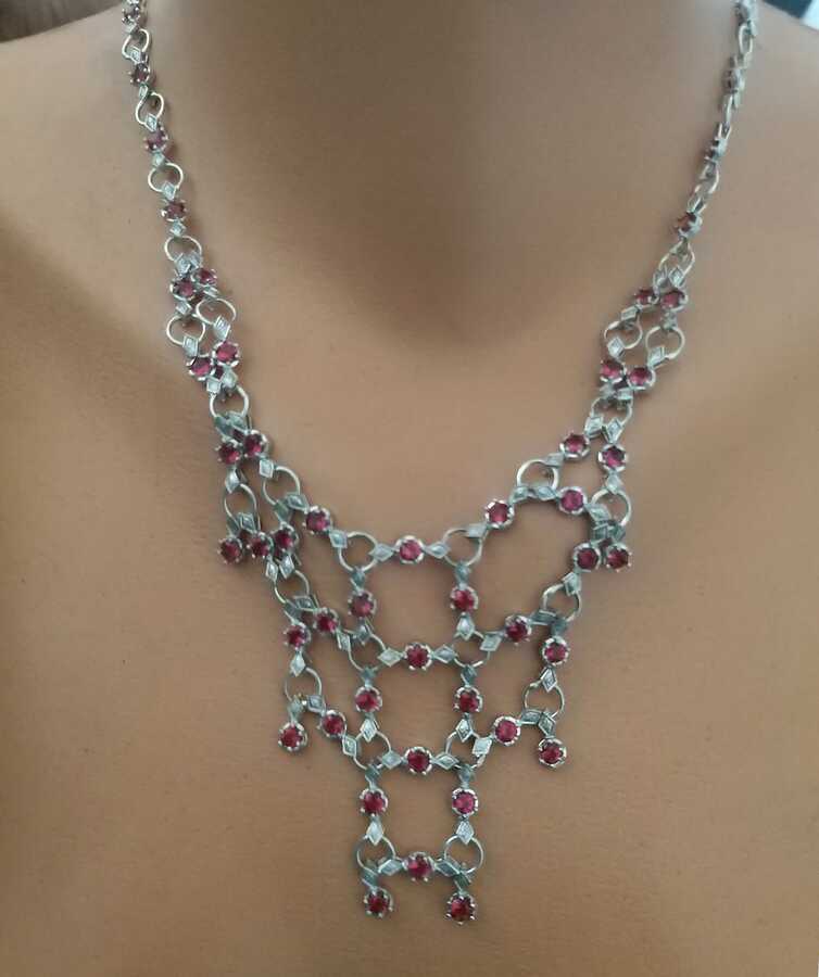 925 ayar gümüştür 49 cm uzunluğunda sentetik yakut taşlarla işlenmiş gerdanlık 6 cm genişliktedir. Gramı: 25,35 gr