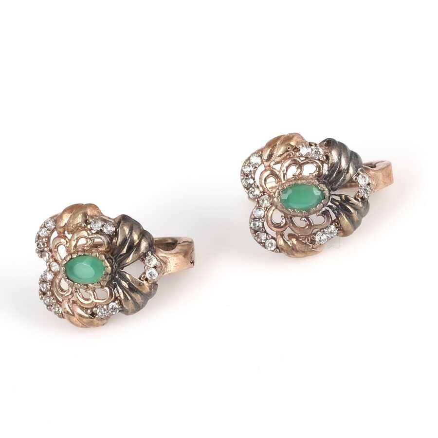 925 Ayar gümüştür. 18 x 12 mm ebadında sentetik zümrüt ve zirkon taşlı, rose siyah rodajlı küpe. Gramı: 3,59 gr