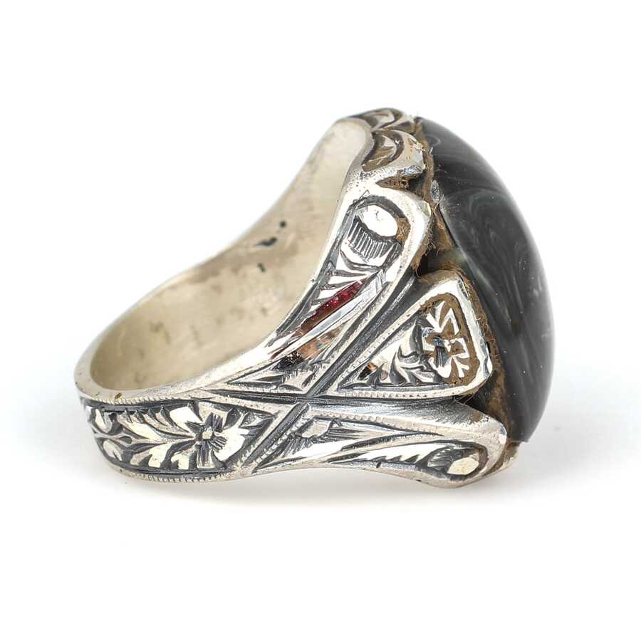 Yüzük 925 ayar gümüşten üretilmiştir. Yüzüğün üzerinde el kalemi atılarak tasarlanmıştır. Taşlı yüzük 2,0 cm'ye 1,8 cm boyutlarındadır. Resimdeki yüzük 25 ölçüdür, ancak tüm ölçüler özel olarak yapılabilmektedir. Yüzük sıkma kehribar taşlıdır. Ağırlığı 14,27 gramdır.