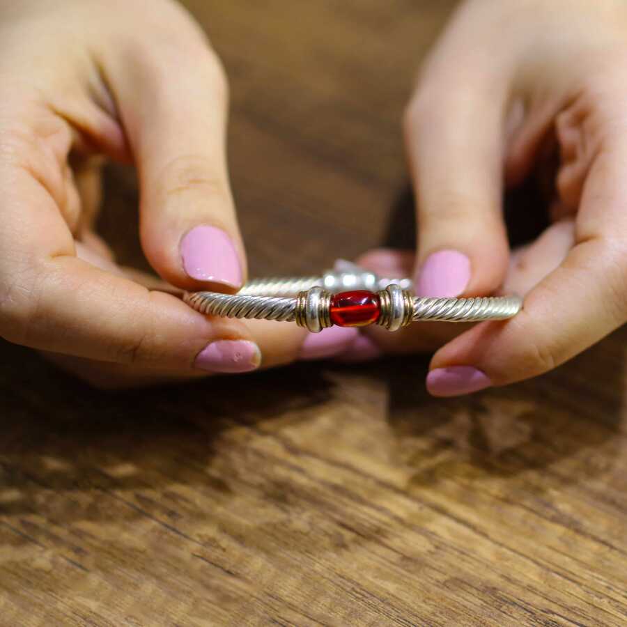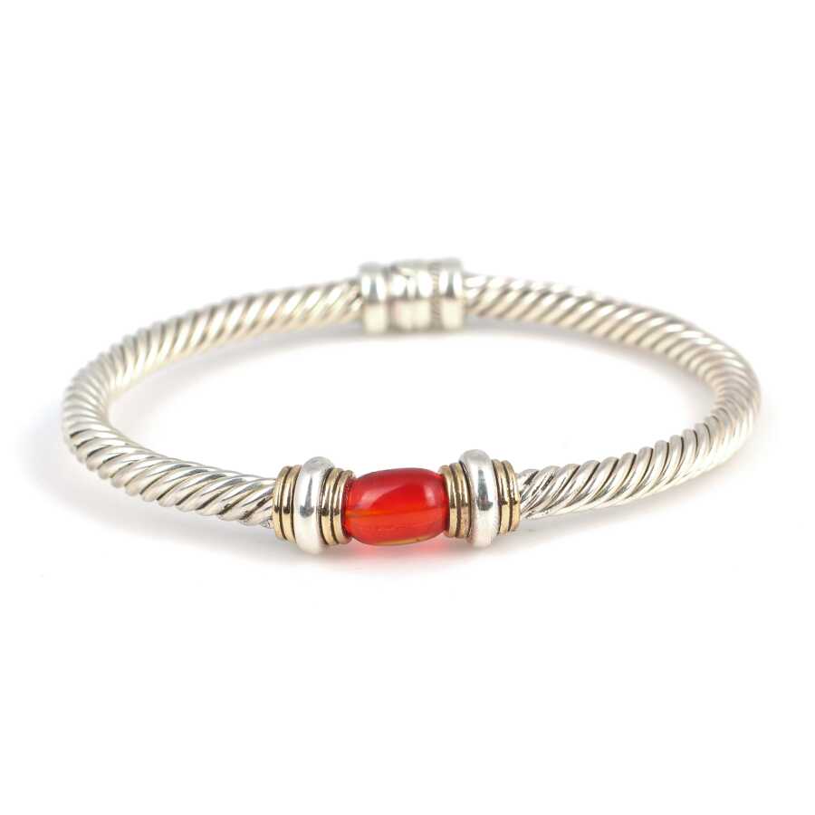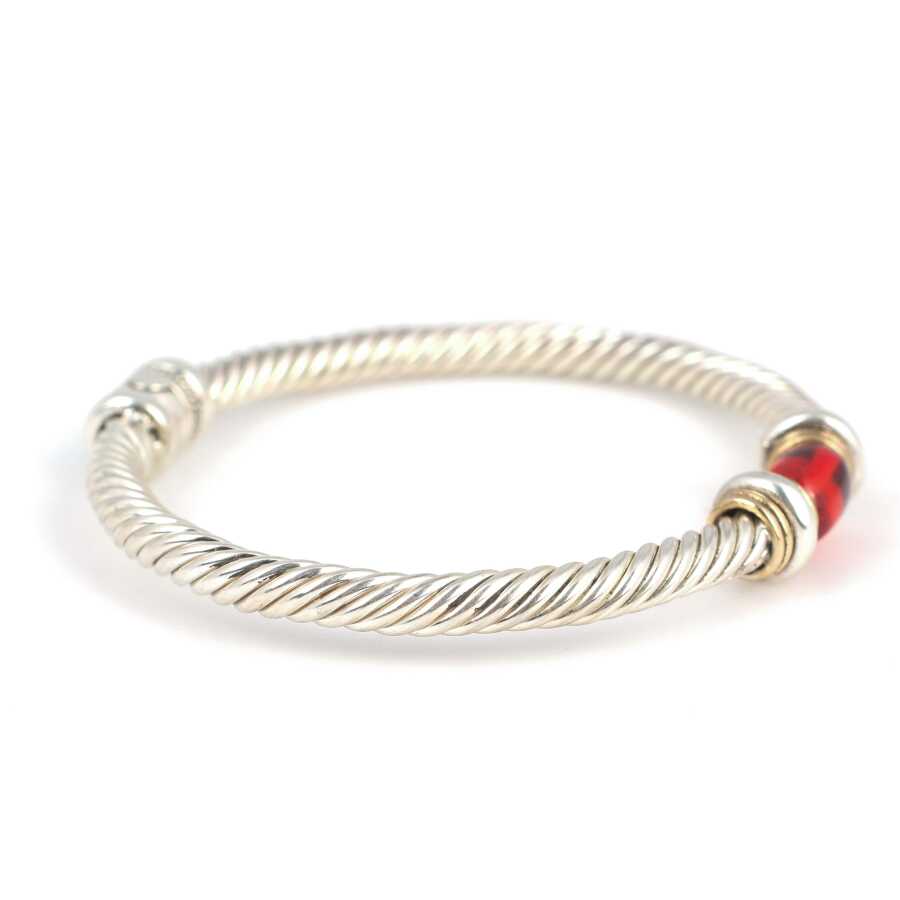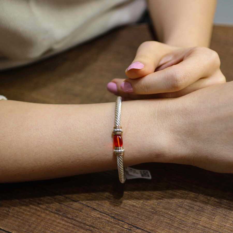 Bilezik 925 ayar gümüşten imal edilmiştir. Çift renkli 6 tel burgu bilezik 5,9 cm çapındadır. Bileziğin önü 0,9 cm genişliğindedir. Bilezik yaylı ve sıkma kehribar taşlıdır.Ağırlığı 23,9 gramdır.