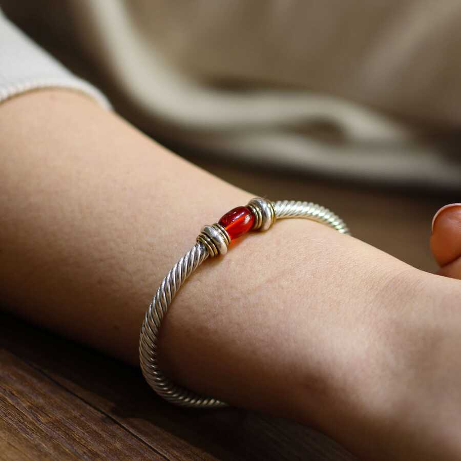 925 Ayar Gümüş Sıkma Kehribar Taşlı Yaylı Burgu Kollu Erkek Bileziği