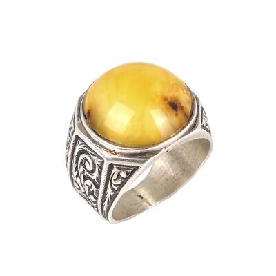 925 Ayar Gümüş Sıkma Kehribar Taşlı Yuvarlak Erkek Yüzük