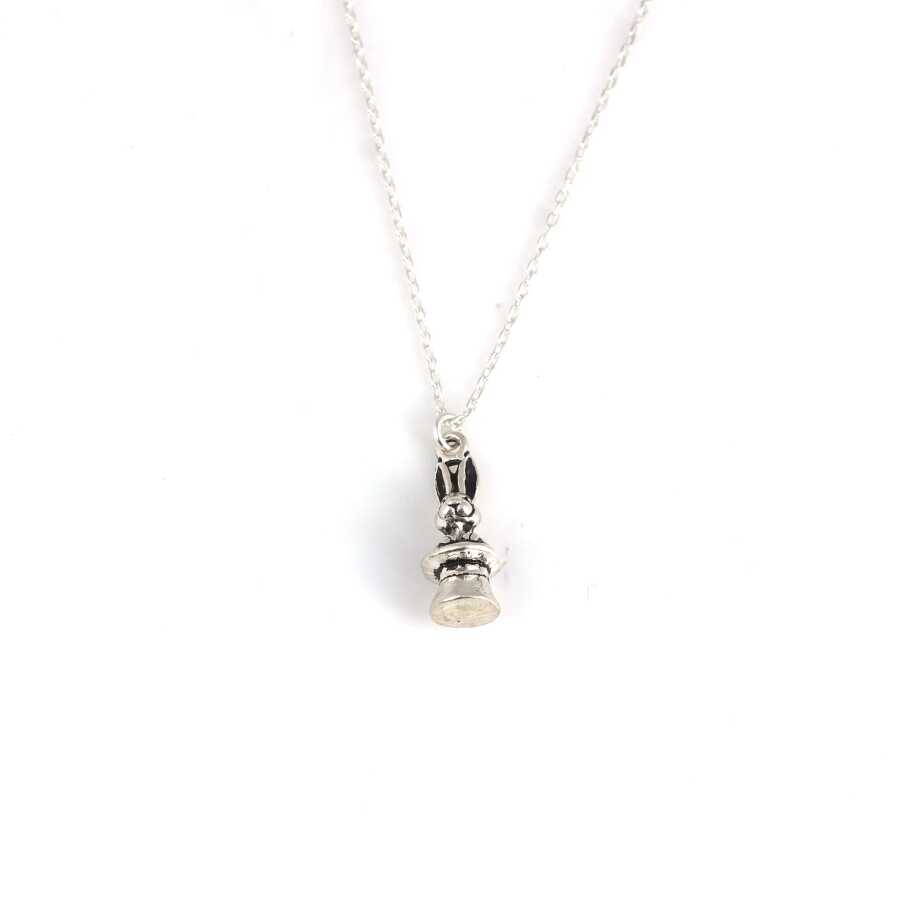 Gümüş kolye 925 ayar gümüşten yapılmıştır. Gümüş kolye 45 cm uzunluğundadır. Şapka içinden çıkan tavşan şeklinde kolye 2,7 cm'ye 1,7 cm boyutlarındadır. Kolye taşsızdır. Charm Kolye 3,24 gramdır.