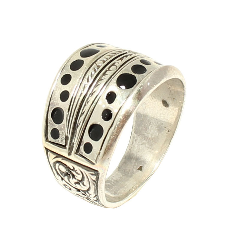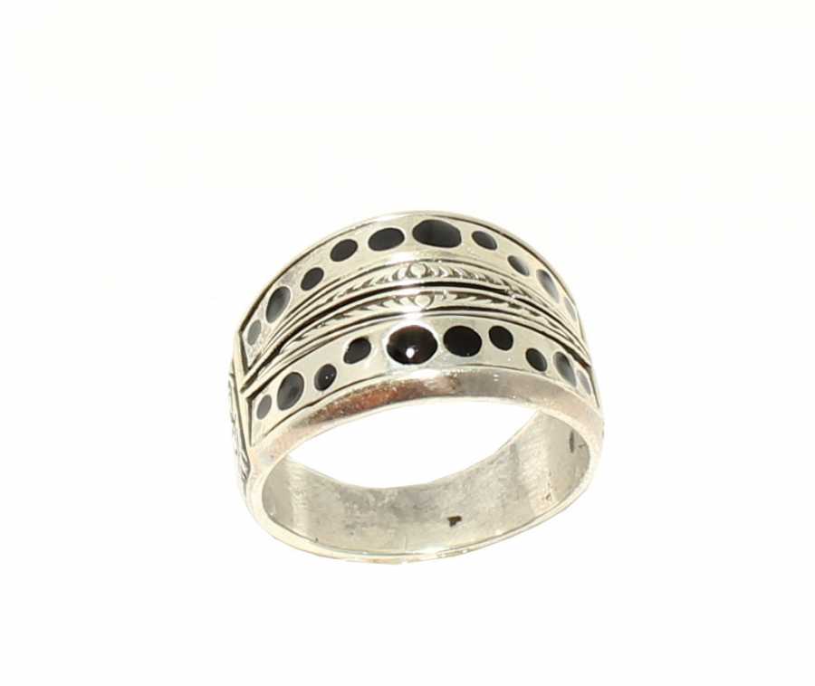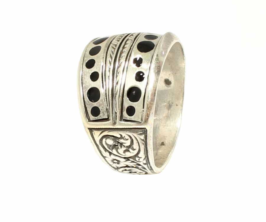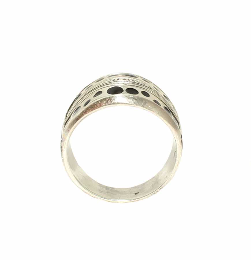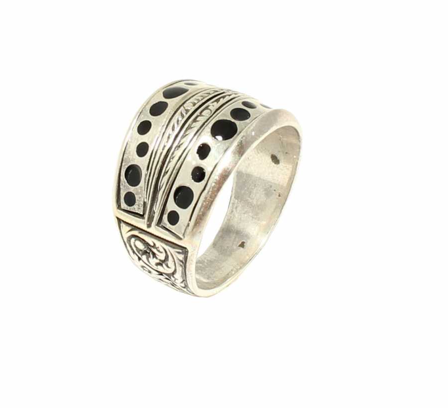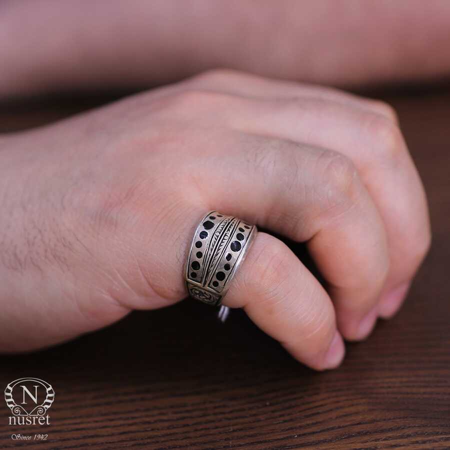 Yüzük 925 ayar gümüşten üretilmiştir. Gümüş yüzüğün üst kısmı siyah renk mine yapılmıştır. Yüzüğün üst kısmı 2,0 cm'ye 2,1 cm boyutlarındadır. Resimdeki yüzük 20 ölçüdür, ancak tüm ölçüler yapılabilmektedir. Yüzük taşsızdır. Ağırlığı 9,02 gramdır.