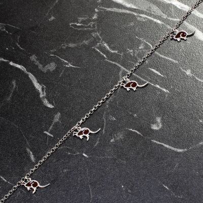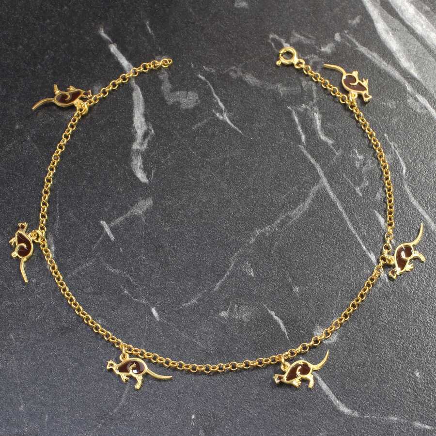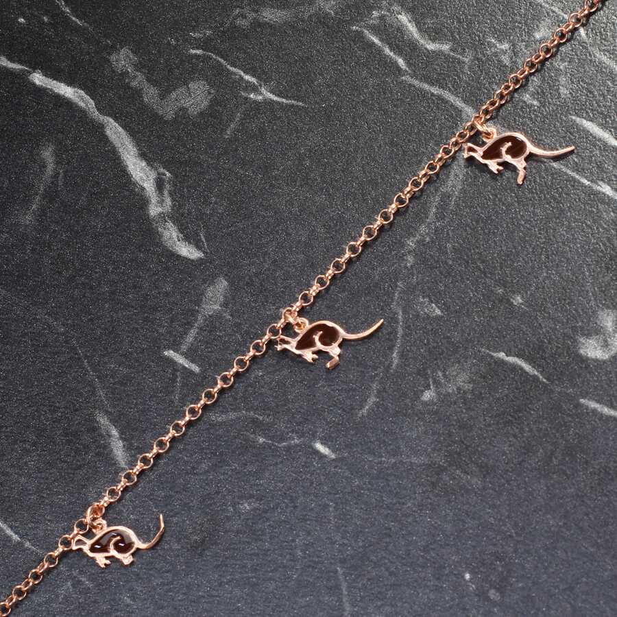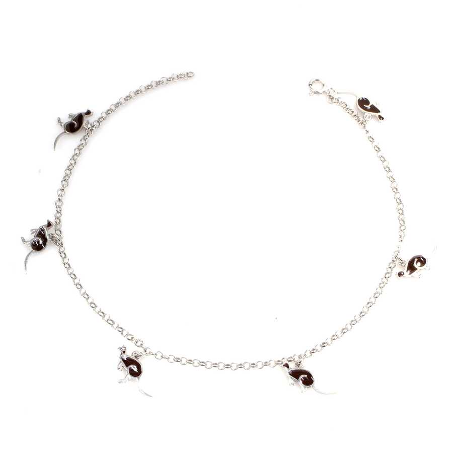 925 ayar gümüştür. 24 cm uzunluğunda 6 adet kanguru mineli parçanın doç zincire monte edilmesi ile oluşan Pembe Beyaz sarı renkli halhaldır. Gramı: 4,4 gr925 Ayar Gümüş Siyah Mineli Kanguru Halhal