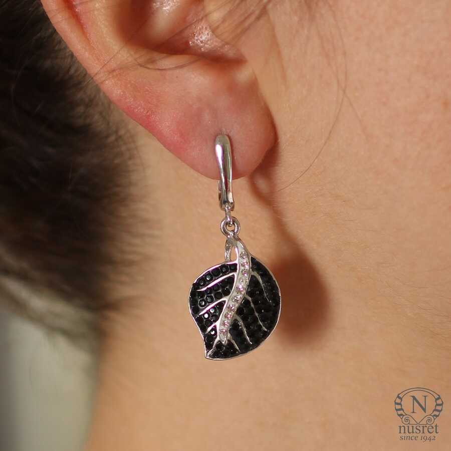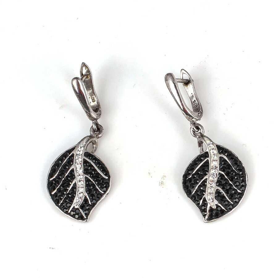 Gümüş küpe 925 ayar gümüşten yapılmıştır. Yaprak şeklindeki taşlı küpe 1,7 cm'ye 4,0 cm boyutlarındadır. Küpe siyah ve beyaz renk zirkon taşlıdır. Ağırlığı 9,74 gramdır.