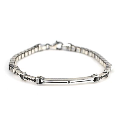 Gümüş bileklik 925 ayar gümüşten yapılmıştır. Gümüş küp zincir model bileklik 0,5 cm kalınlığındadır. Taşlı parçalardan oluşan bileklik 21 cm uzunluğundadır. Gümüş bileklik siyah zrikon taşlıdır. Ağırlığı 16,02 gramdır.