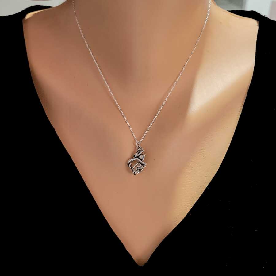 Gümüş kolye 925 ayar gümüşten yapılmıştır. Gümüş kolye 45 cm uzunluğundadır. Şnorkel ve palet şeklinde kolye 1,8 cm'ye 1,5 cm boyutlarındadır. Kolye taşsızdır. Charm Kolye 3,49 gramdır.