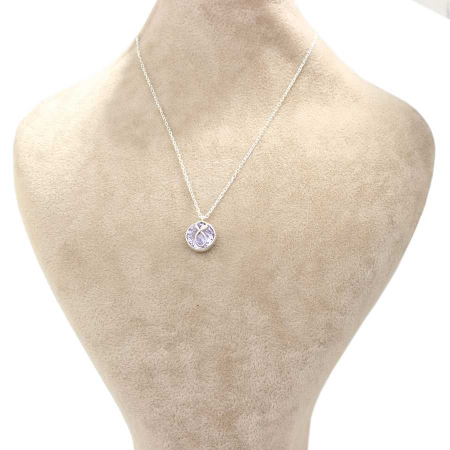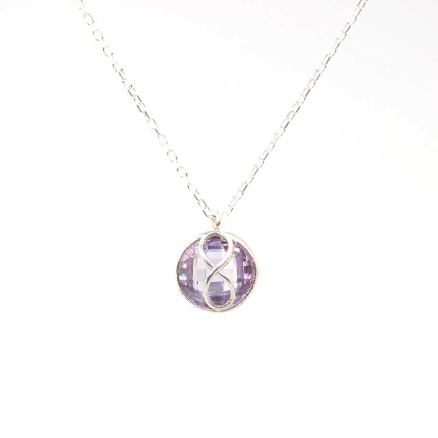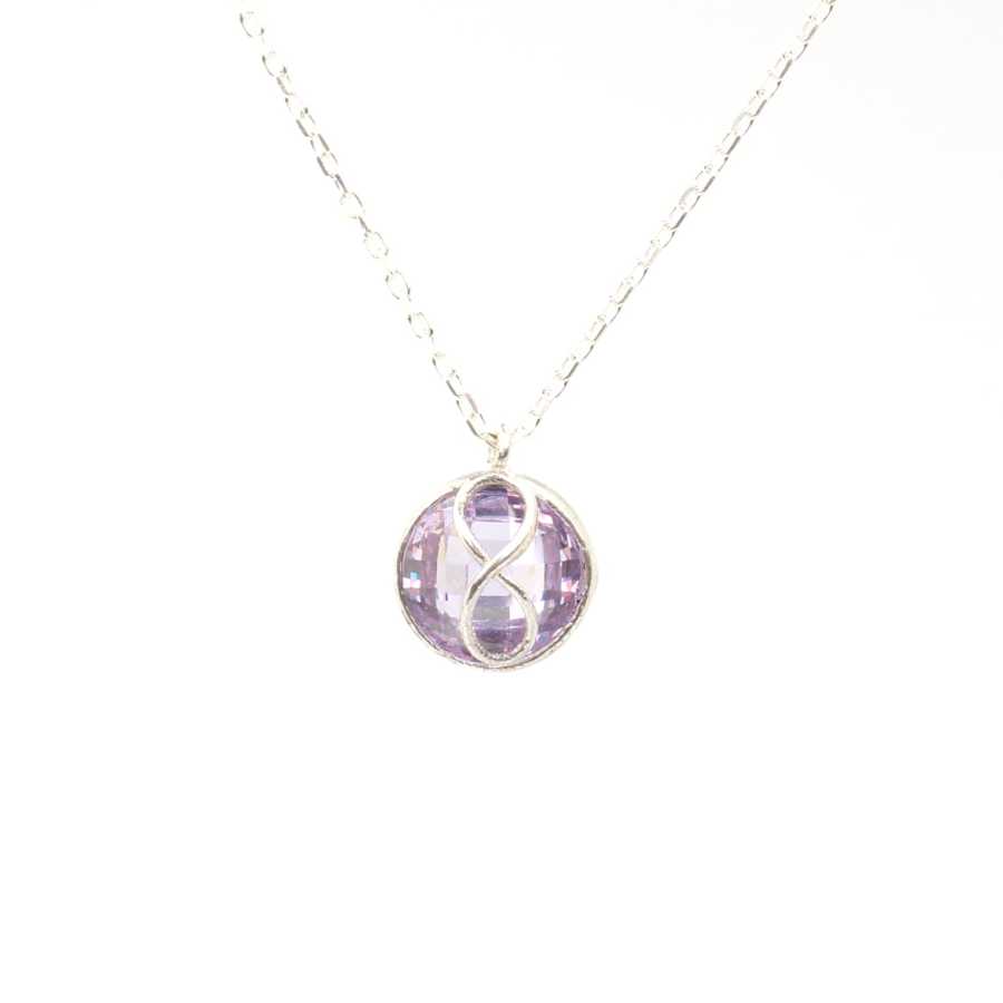 Gümüş kolye 925 ayar gümüşten yapılmıştır. Yuvarlak şeklinde taş üzerine sonsuzluk şeklindeki kolye 1,0 cm boyutlarındadır. Zinciri 45 cm uzunluğundadır ve taşları ametist renk zirkondur. Ağırlığı 2,4 gramdır.