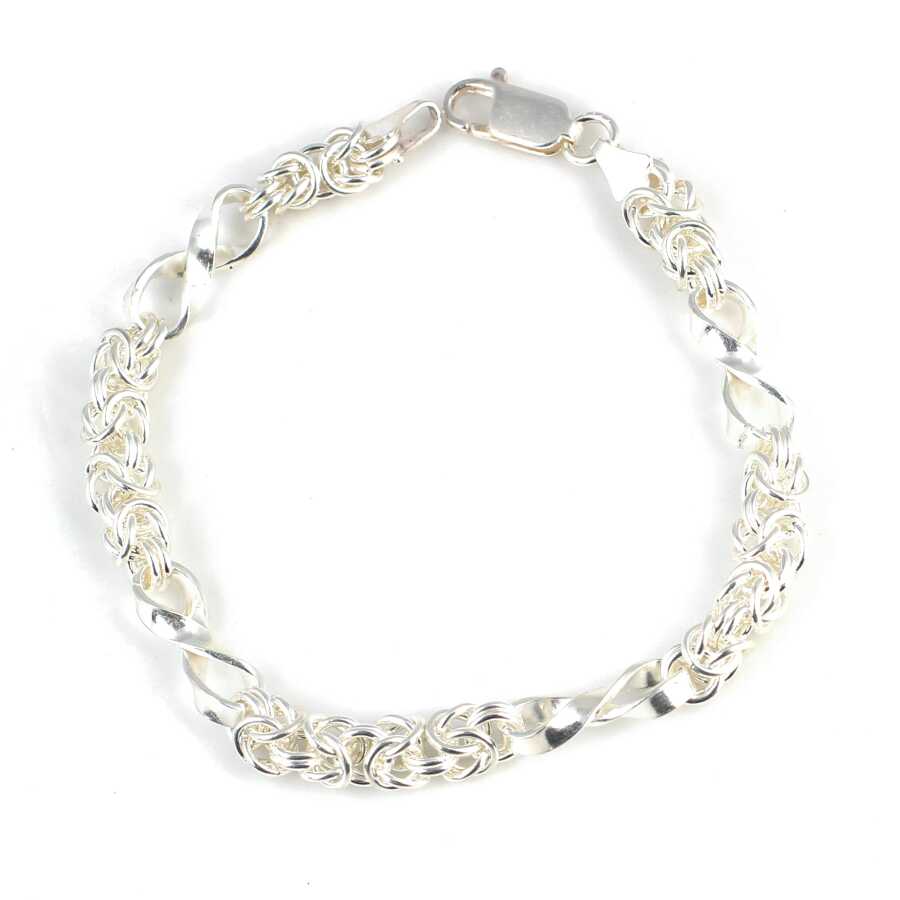 Gelince Haber Ver Bileklik 925 ayar gümüşten imal edilmiştir. Sonsuzluk model bileklik 20 cm uzunluğundadır. Bileklik 0,6 cm genişliğindedir. Gümüş ara parçalar 0,6 cm'ye 1,2 cm boyutlarındadır. Bileklik taşsızdır. Zincir bileklik gümüş renk rodajlıdır. Ağırlığı 15,64 gramdır.