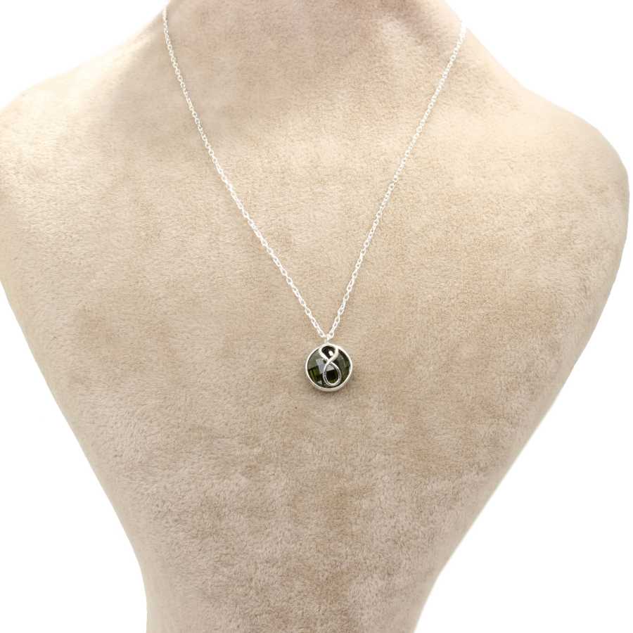 Gümüş kolye 925 ayar gümüşten yapılmıştır. Yuvarlak şeklinde taş üzerine sonsuzluk şeklindeki kolye 1,0 cm boyutlarındadır. Zinciri 45 cm uzunluğundadır ve taşları peridot renk zirkondur. Ağırlığı 2,35 gramdır.