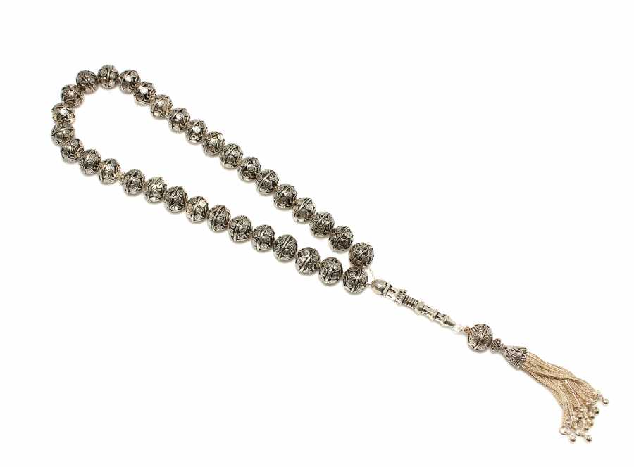 925 Ayar Gümüş Spiral Telkari Motifli Tesbih, Minare Desenli İmame