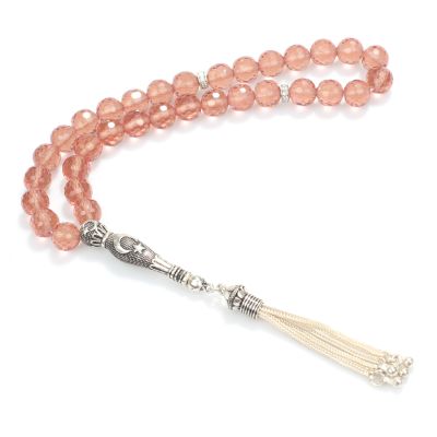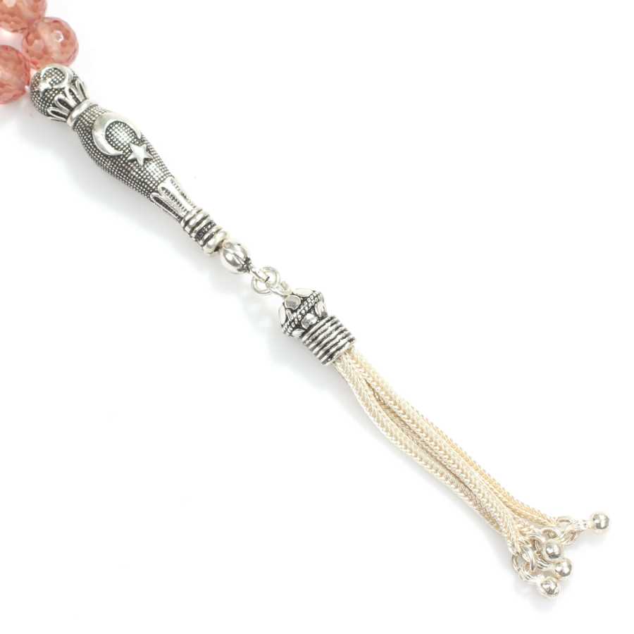 925 Ayar Gümüş püsküllü Sultanayt yuvarlak fasetli taşlı. Taşın boyutu: 8 mm, taş boyutu uzunluğu: 13,5 cm, imame boyu:4 cm, püskül uzunluğu: 6,5 cm. Ay yıldızlı imamesi ile Orijinal bir tesbihtir. Gramı: 39,41 gr