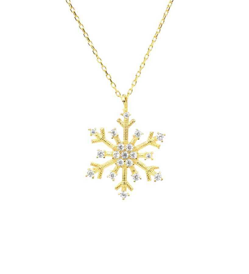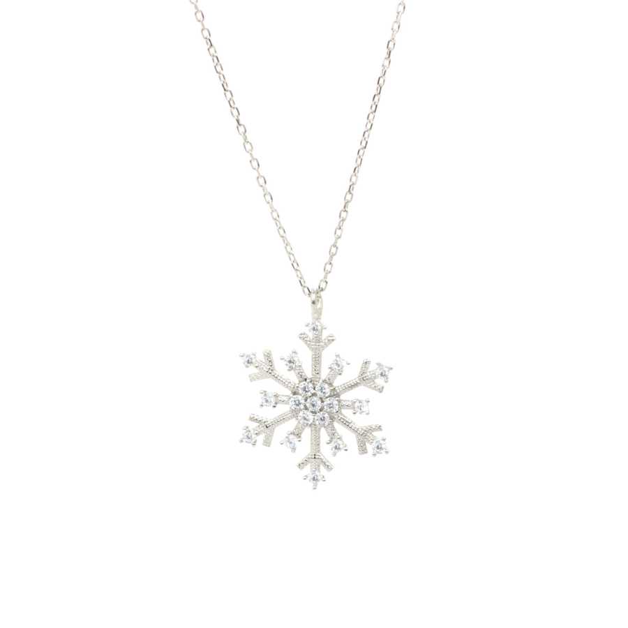 925 ayar gümüştür. 40 cm zincir uzunluğunda + 5 cm uzatma zinciri ile birlikte 45 cm zincir uzunluğundadır. İstenilen renk yapılmaktadır. Beyaz zirkon taşıdır. Kar tanesi boyutu: 2,4 x 2,1 cm (Halka dahildir.) Gramı: 2,25 gr