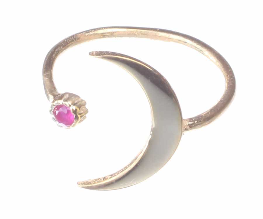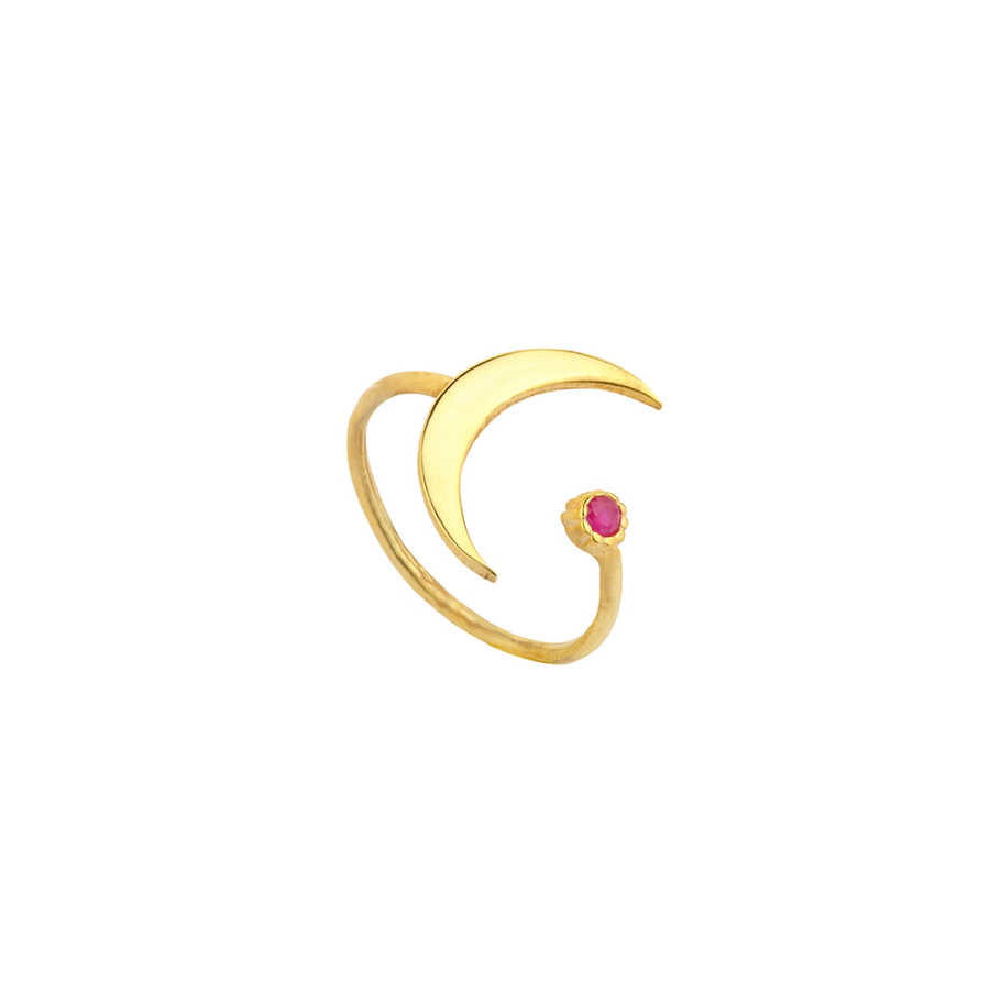 Yüzük 925 ayar gümüşten üretilmiştir. Ay ve karşısında tek taş yüzük ayarlanabilir ölçüdür. Yüzük pembe zirkon taşlıdır. Eklem yüzüğü olarak ta kullanabilirsiniz. Ay parçası 1,7 cm'ye 1,1 cm boyutlarındadır. Sarı rodaj kaplama yapılmıştır. Ağırlığı 1,71 gramdır.