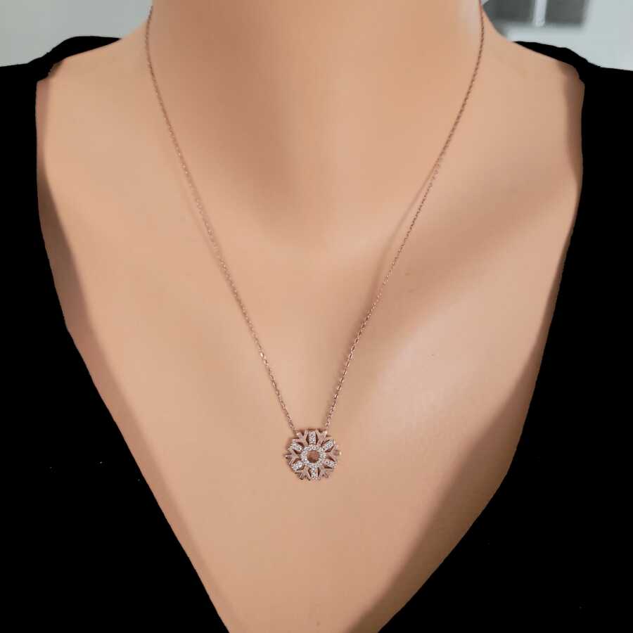 Gümüş kolye 925 ayar gümüşten yapılmıştır. Kar tanesi şeklindeki kolye 1,4 cm boyutlarındadır. Zinciri 45 cm uzunluğundadır ve taşları beyaz zirkondur. Ağırlığı 2,33 gramdır.