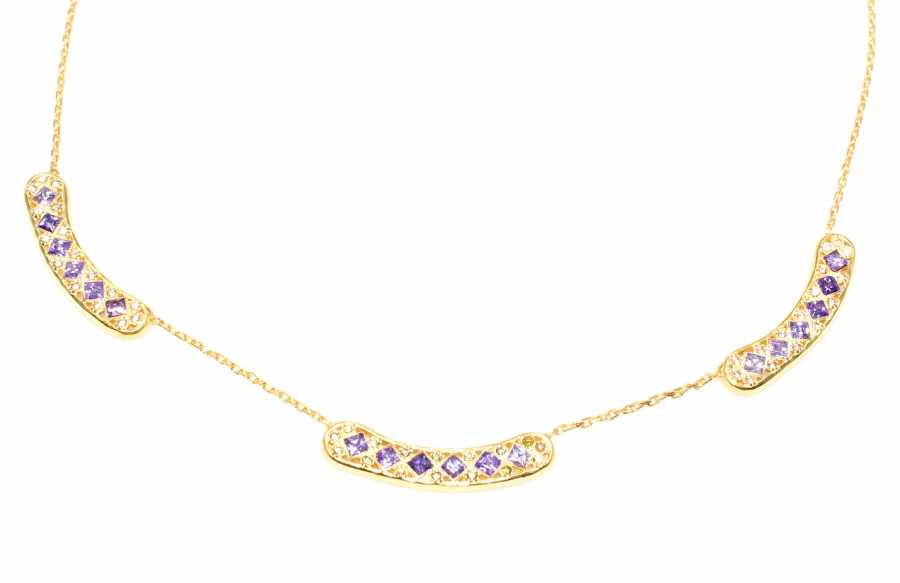 Gümüş kolye 925 ayar gümüşten yapılmıştır. Gümüş kolye 2,4 cm'ye 0,4 cm boyutlarındadır. Zinciri 42 cm uzunluğundadır. Kolye mor ve beyaz zirkon taşlıdır. Ağırlığı 4,55 gramdır.
