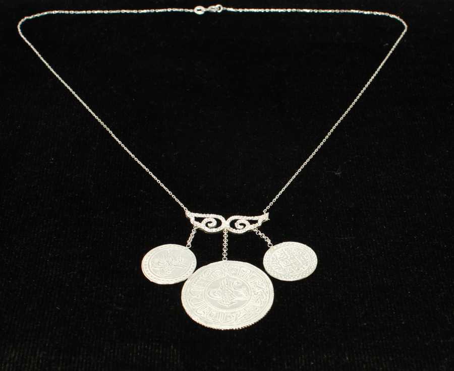925 Ayar gümüştür. Taşlı montüre bağlı 3 adet Mahmudiye parası 46 cm zincirle bütünleşmiştir. Gramı:7,82 gr