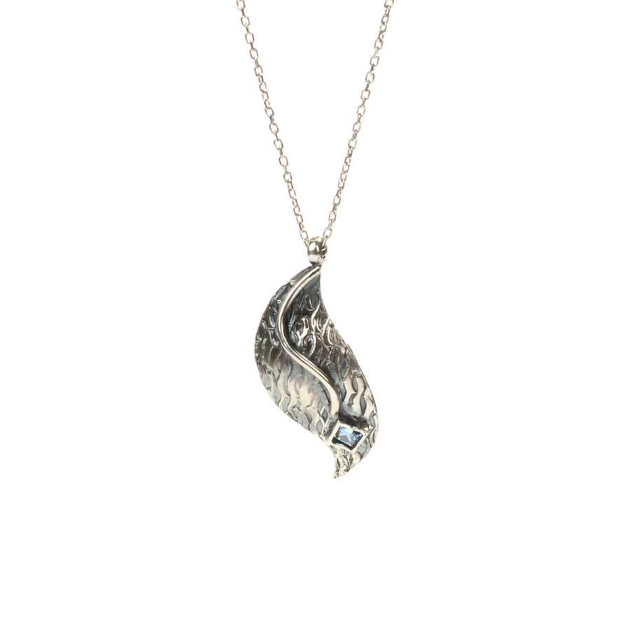 Gümüş kolye 925 ayar gümüşten yapılmıştır. Yaprak kolye 3,0 cm'ye 1,2 cm boyutlarındadır. Zinciri 45 cm uzunluğundadır. Kolye akuamarin renk zirkon taşlıdır. Ağırlığı 3,57 gramdır.