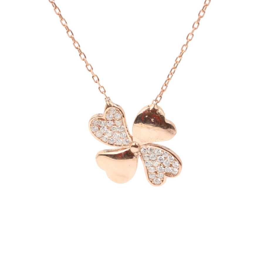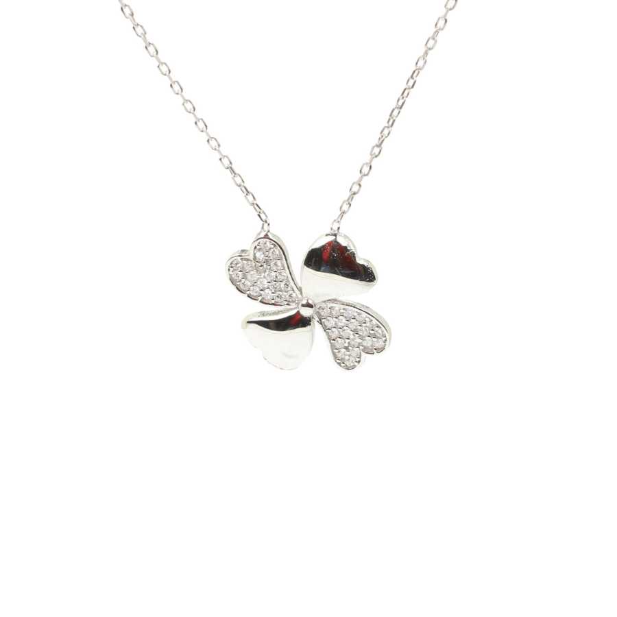 Gümüş kolye 925 ayar gümüşten yapılmıştır. 4 yapraklı yonca şeklindeki kolye 1,7 cm boyutlarındadır. Zinciri 45 cm uzunluğundadır ve taşları beyaz zirkondur. Ağırlığı 2,5 gramdır.