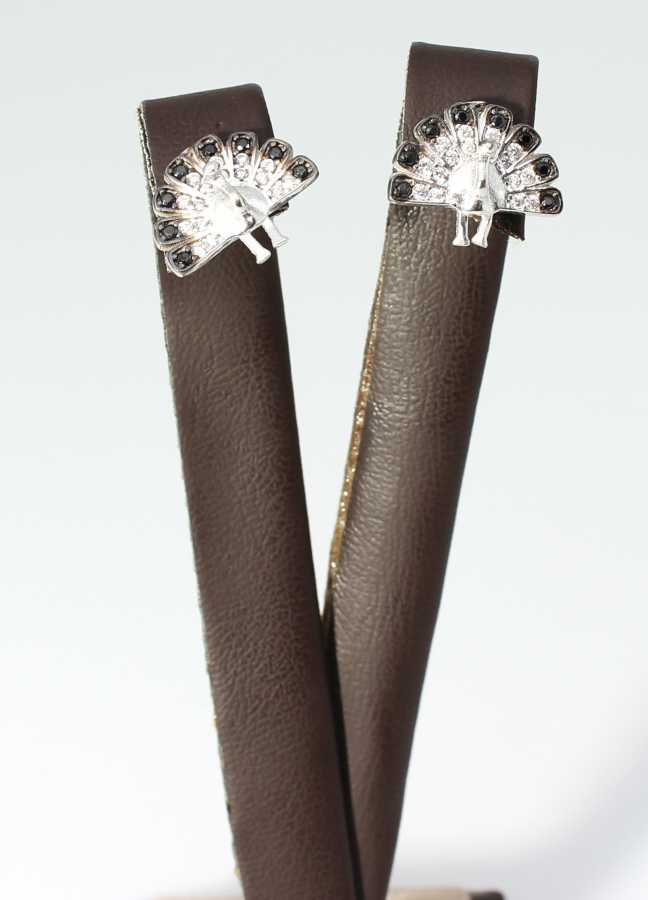 925 Ayar Gümüş Tavus Kuşu Küpe, Beyaz - Siyah Taş