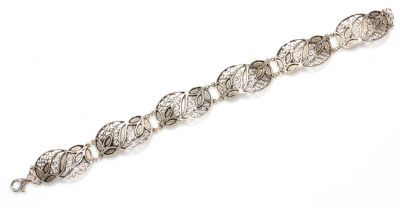 925 Ayar Gümüş 1,4 x 18,5 cm boyutlarında döküm telkari yaprak motifli bilekliktir. Gramı: 11,43