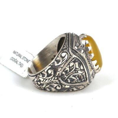 925 Ayar Gümüş Tırnaklı Oval Sarı Akik Taşlı Kalemli Erkek Yüzük