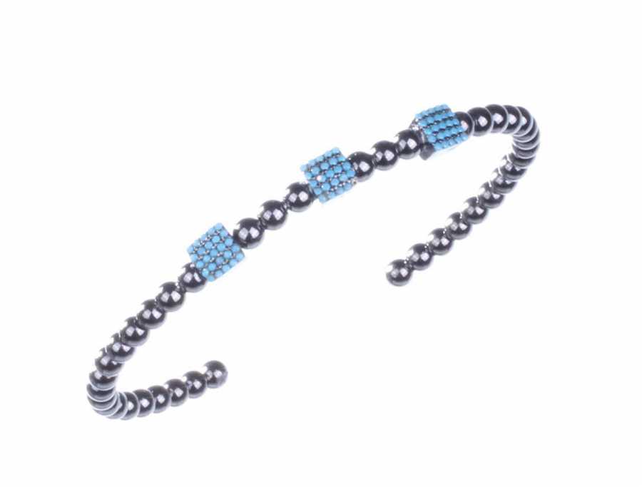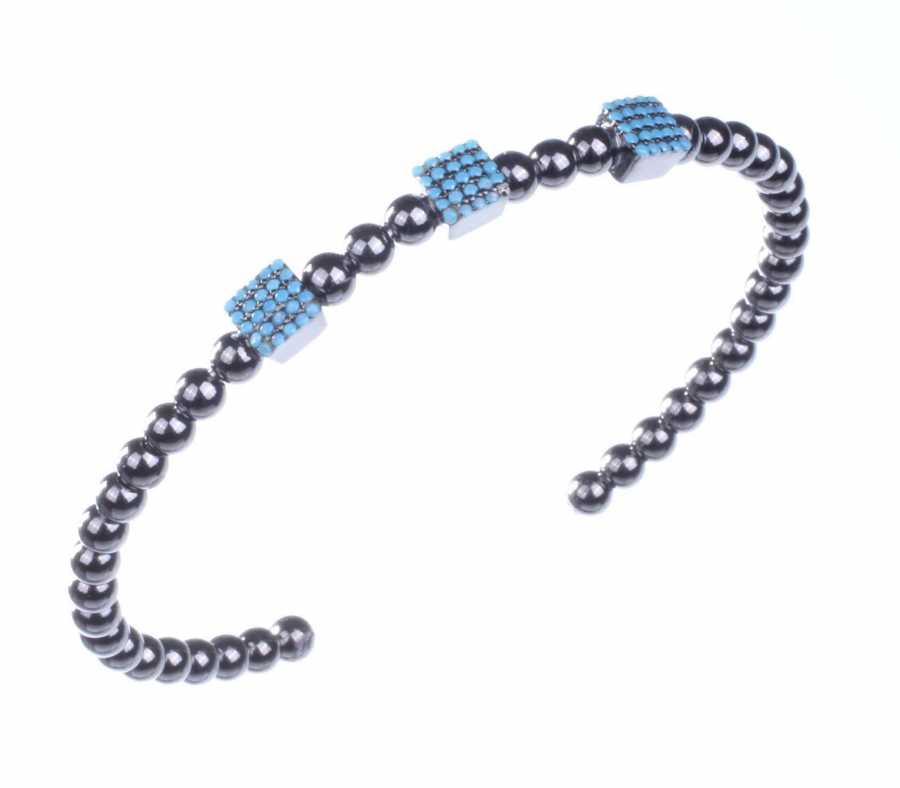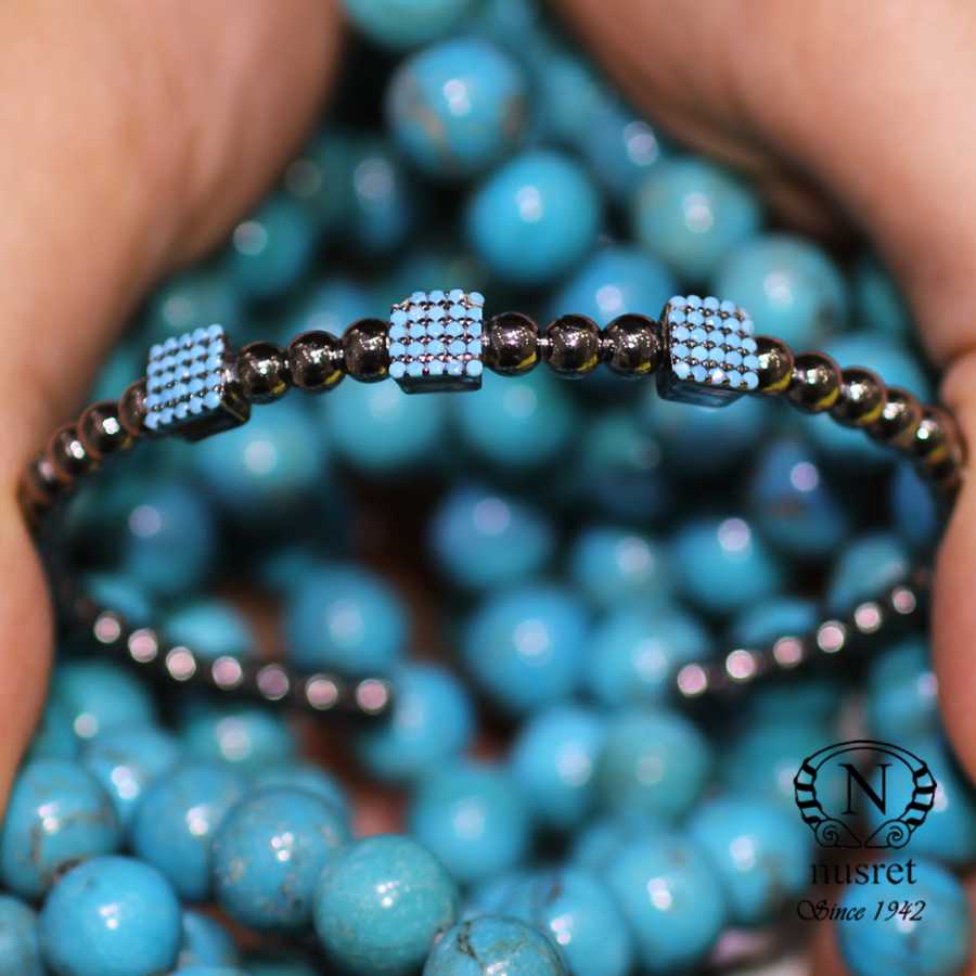 Bilezik 925 ayar gümüşten imal edilmiştir. Oksitli top top bilezik 6,2 cm çapındadır. Bilezik mavi turkuaz taşlıdır. Gümüş bilezik 9,35 gram ağırlığındadır.
