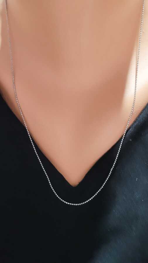 Gümüş kolye 925 ayar gümüşten yapılmıştır. Toplu zincir kolye 50 cm uzunluğundadır. Kolye 1 mm enindedir. Kolye taşsızdır. Ağırlığı 1,52 gramdır.
