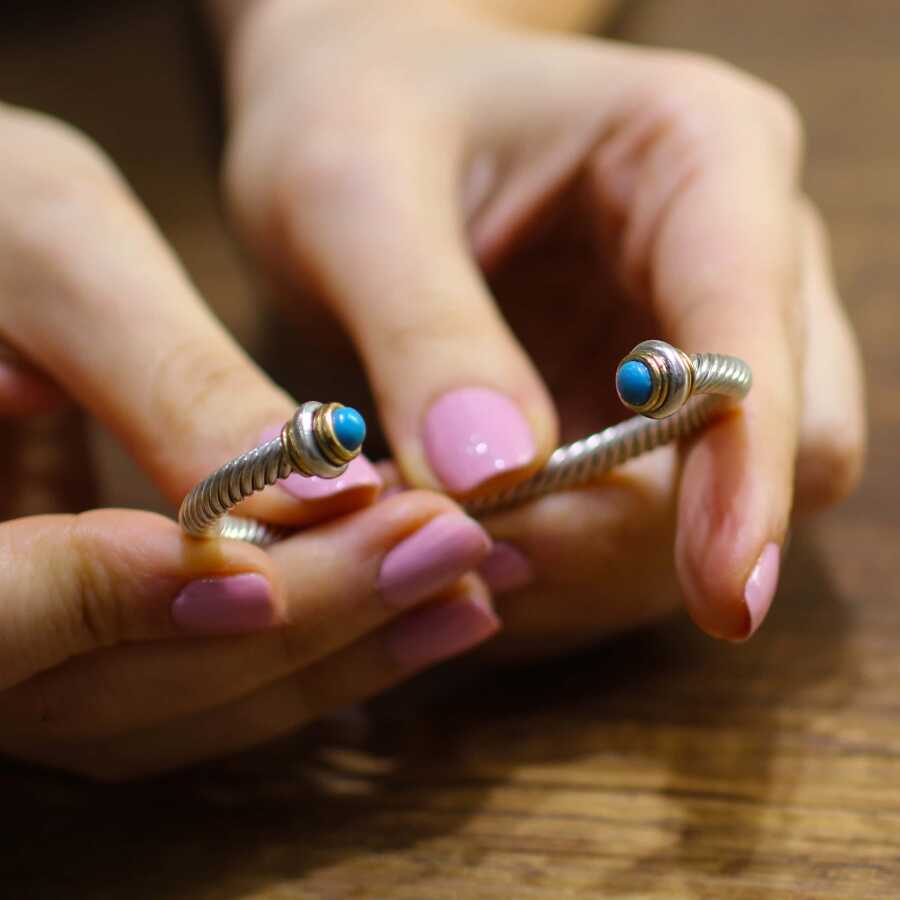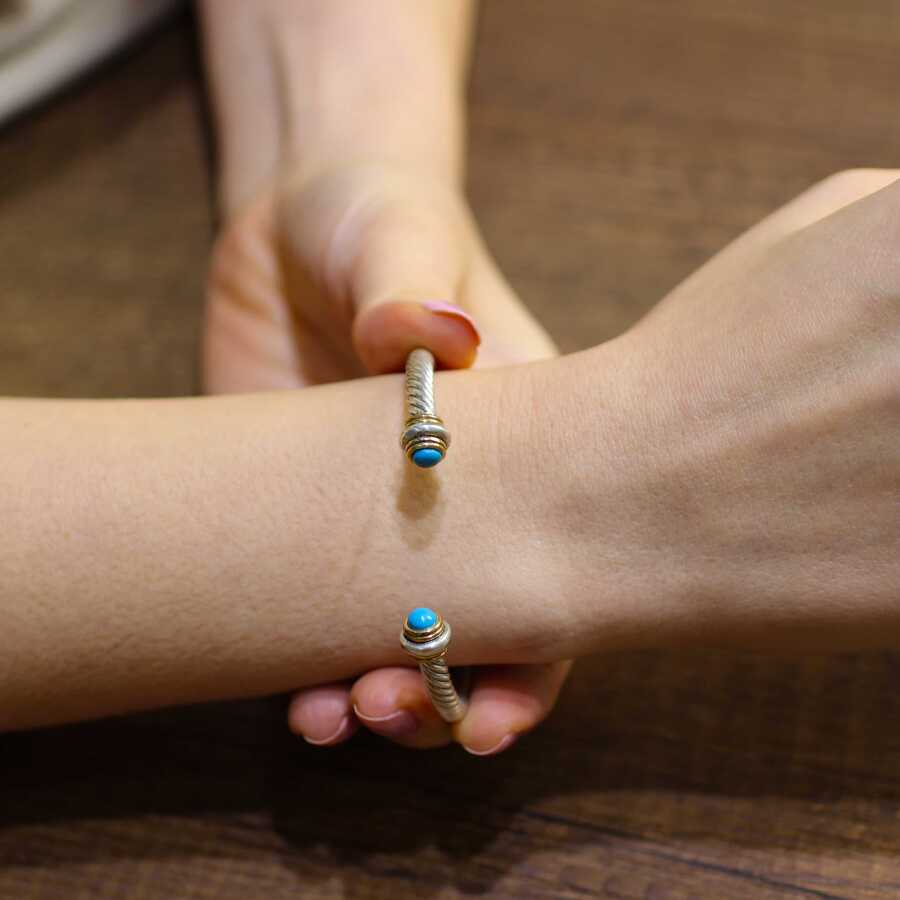 Bilezik 925 ayar gümüşten imal edilmiştir. Çift renkli 6 tel burgu bilezik 6,2 cm çapındadır. Bileziğin önü 1 cm genişliğindedir. Bilezik turkuaz taşlıdır.Ağırlığı 18,68 gramdır.