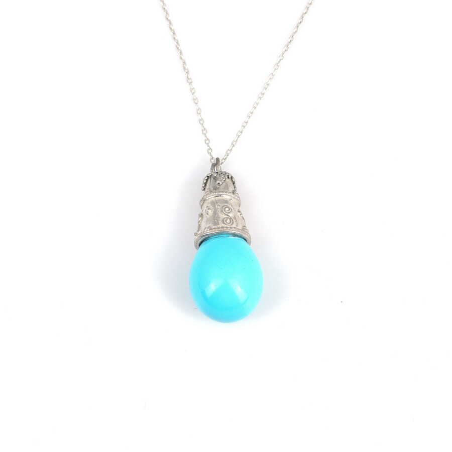 Gümüş kolye 925 ayar gümüşten yapılmıştır. Turkuaz taşlı huni tepelikli kolye halkası dahil 3,4 x 1,4 cm boyutlarındadır. Kolye 45 cm uzunluğundadır. Kolye turkuaz taşlıdır. Gümüş kolye 8,53 gramdır.